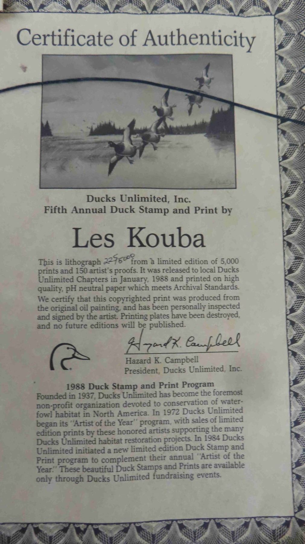 1988 Ducks Unlimited 5th Annual Duck Stamp and Print by Les Kouba 17'' x 15 3/4''