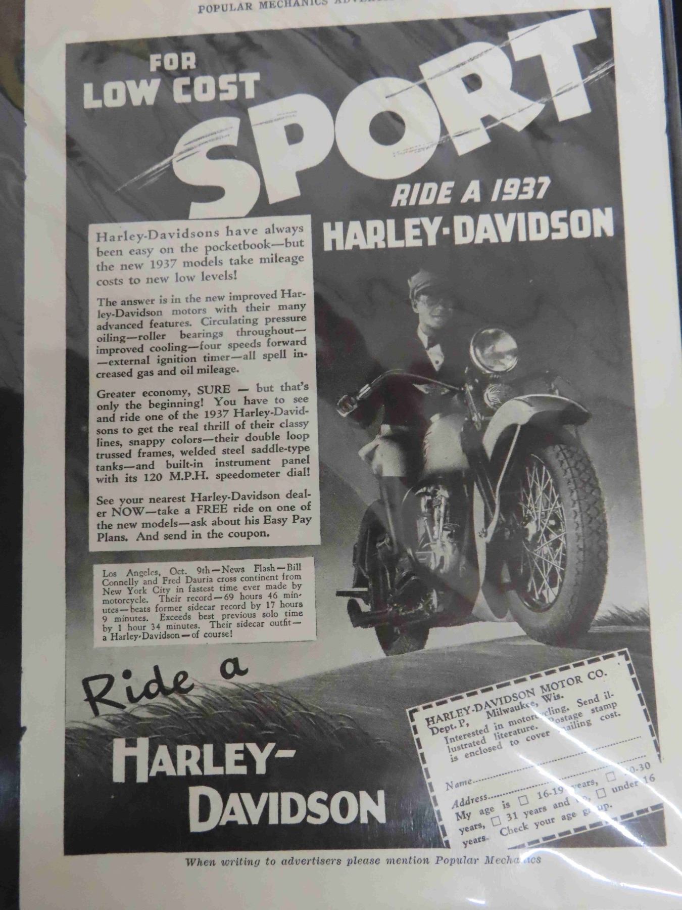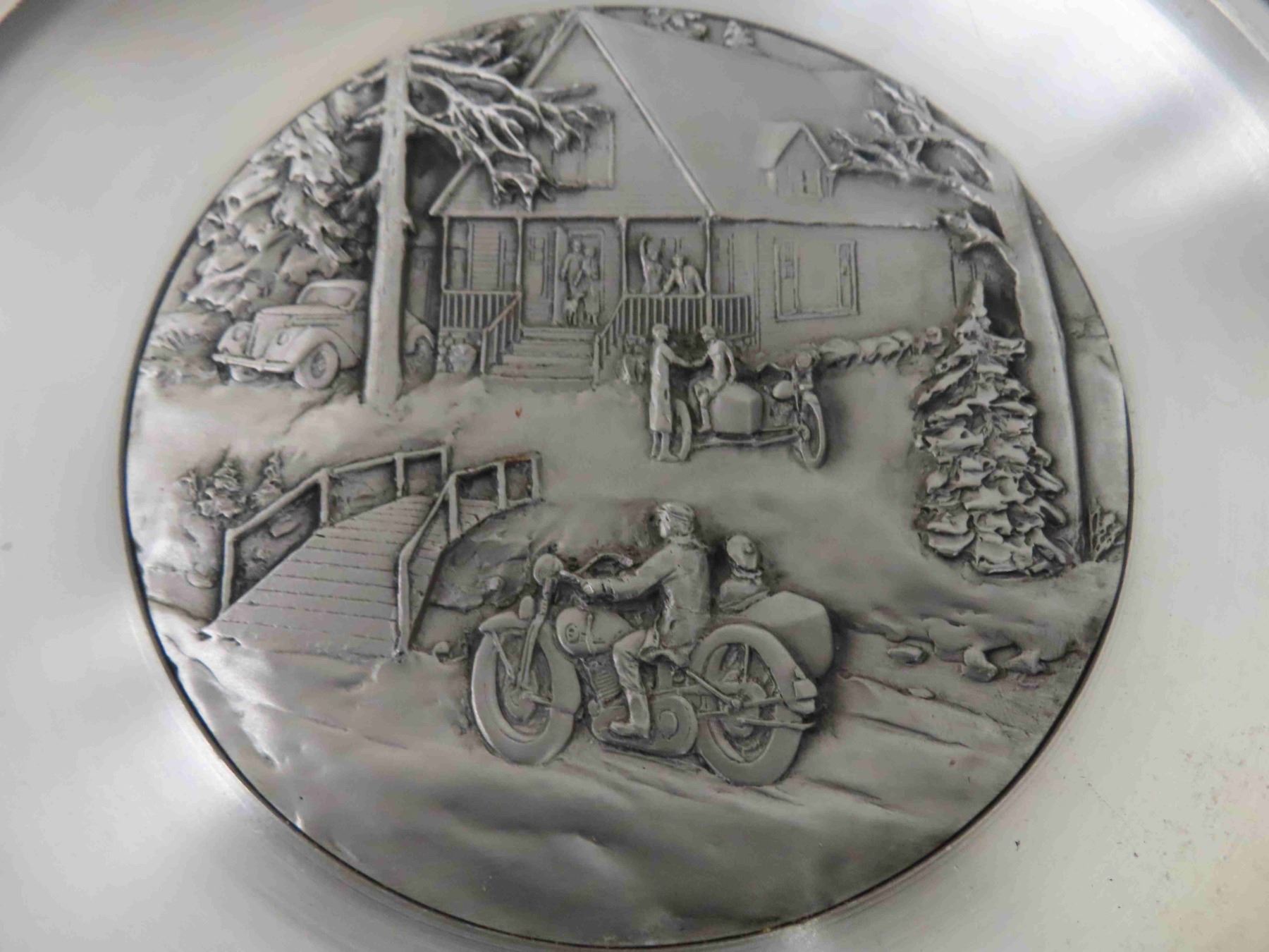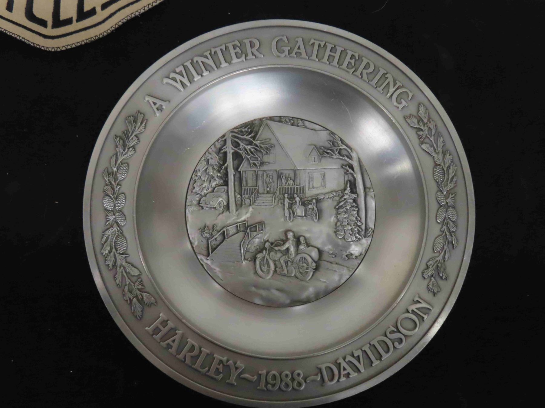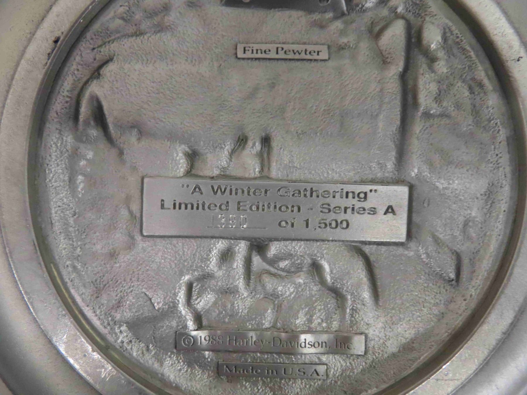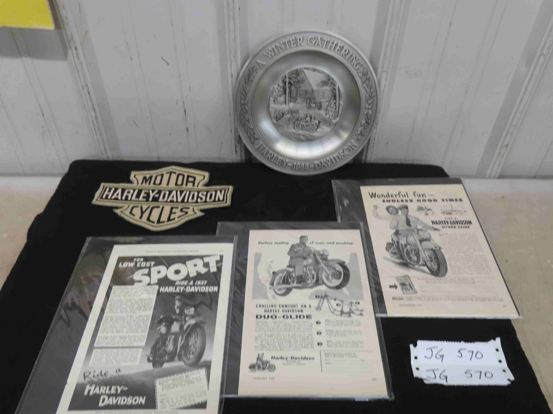 1988 Fine Pewter Harley Davidson 9'' Plaque 'A Winter Gathering' Limited Edition Series A#1390 , Harley Davidson Motorcycle Patch , 3 Harley Davidson Advertisements 1937, 1950 & 1959