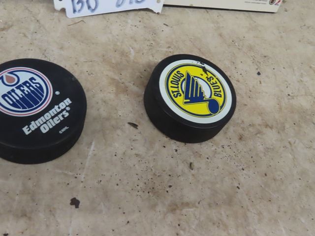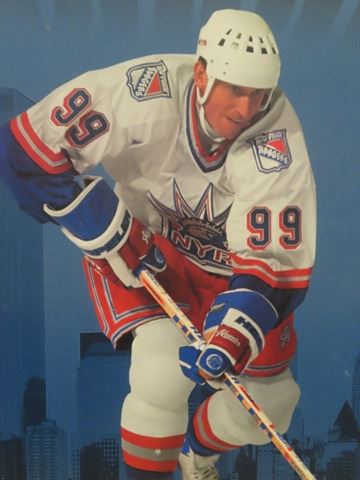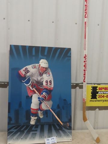 1990 Gretzky Poster Mounted on Hard Board 35" x 23" , NY Rangers Alternate Jersey , Titan Pro 99 Signature Series Hockey Stick & 2 Pucks Blues + Oilers