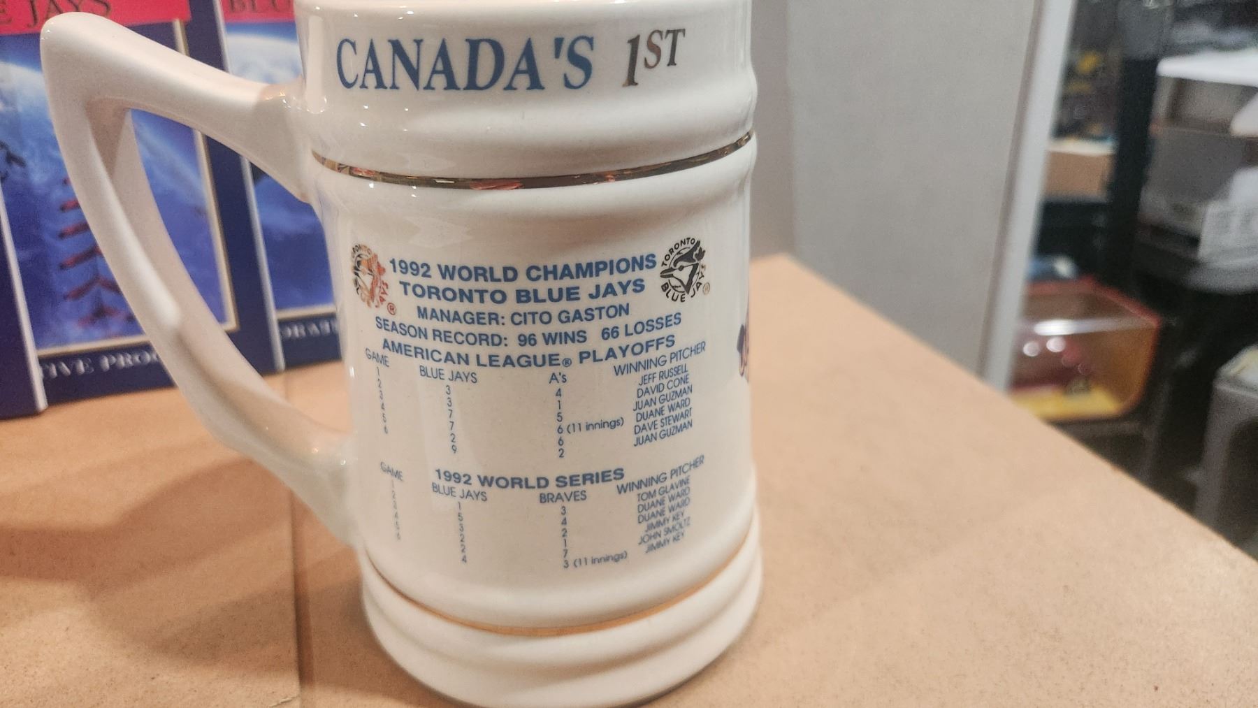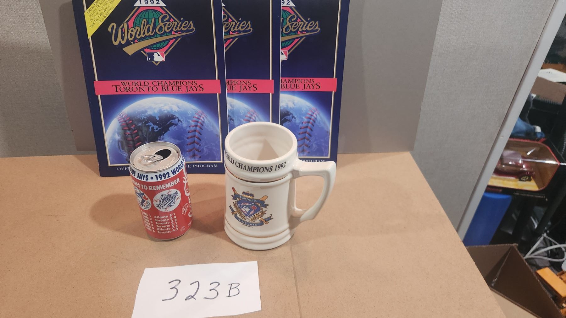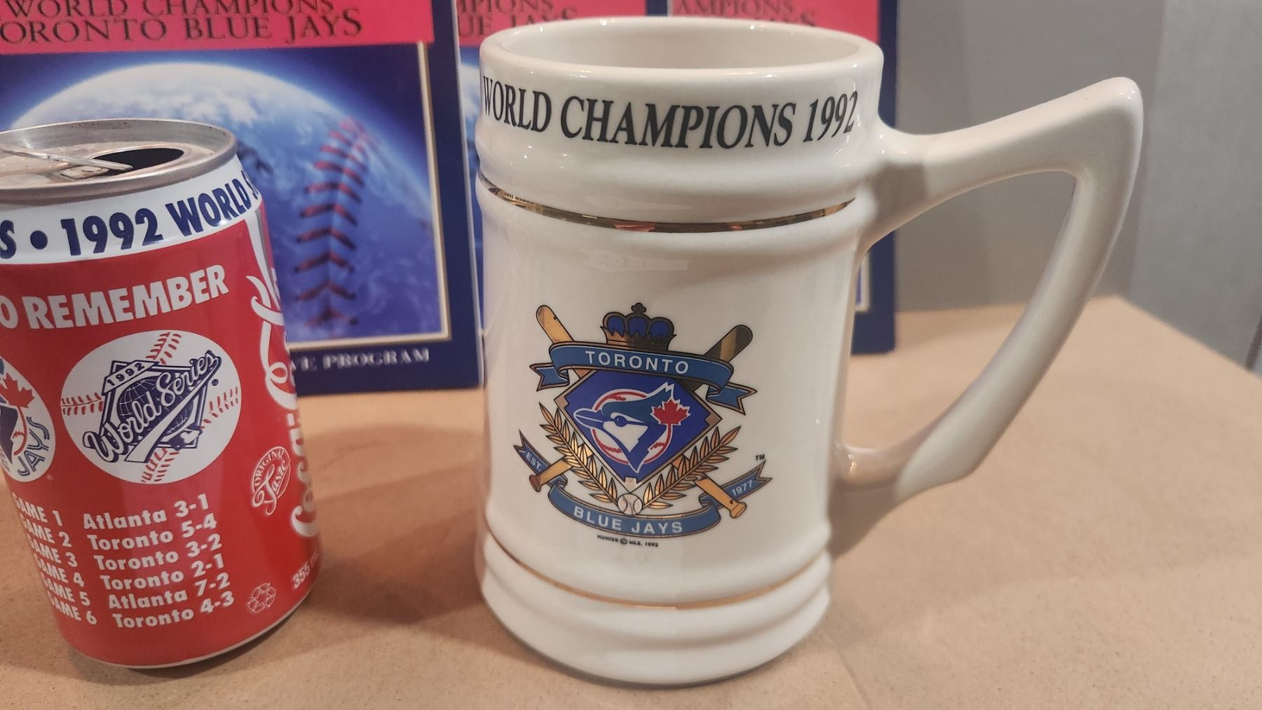 1992 TORONTO BLUE JAYS WORLD SERIES CHAMPS COMMEMORATIVE BEER STEIN, COKE CAN, 3 WORLD SERIES PROGRAMS.