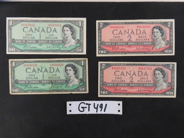 (2) 1954 Canada $1 Bills + (2) $2 Bills