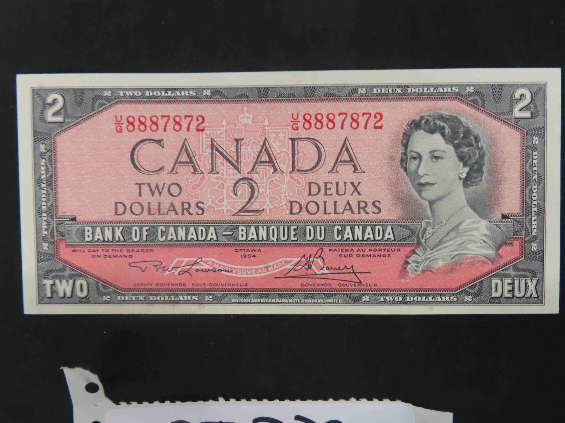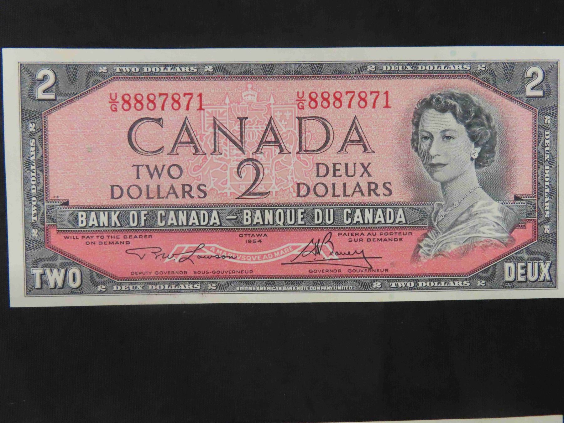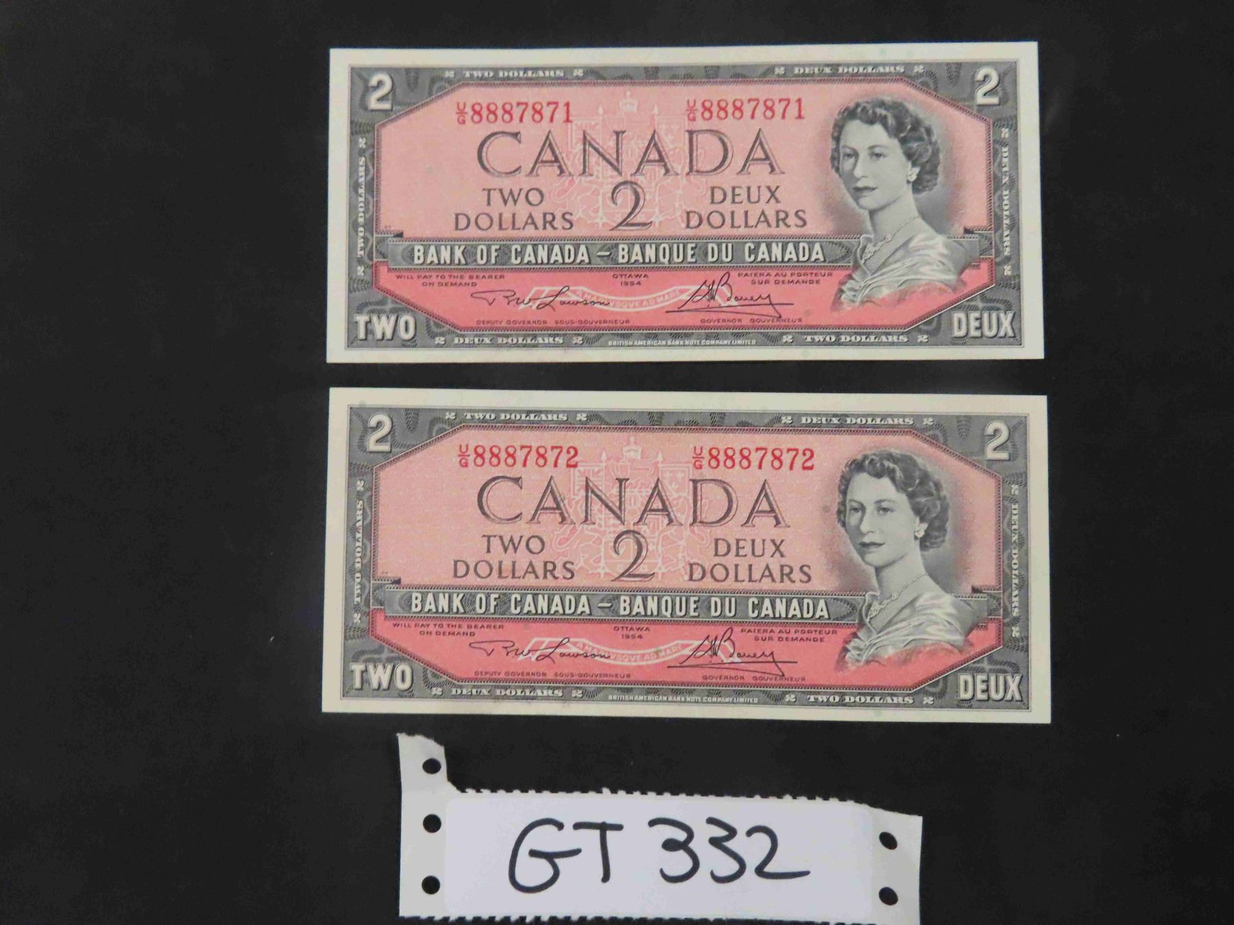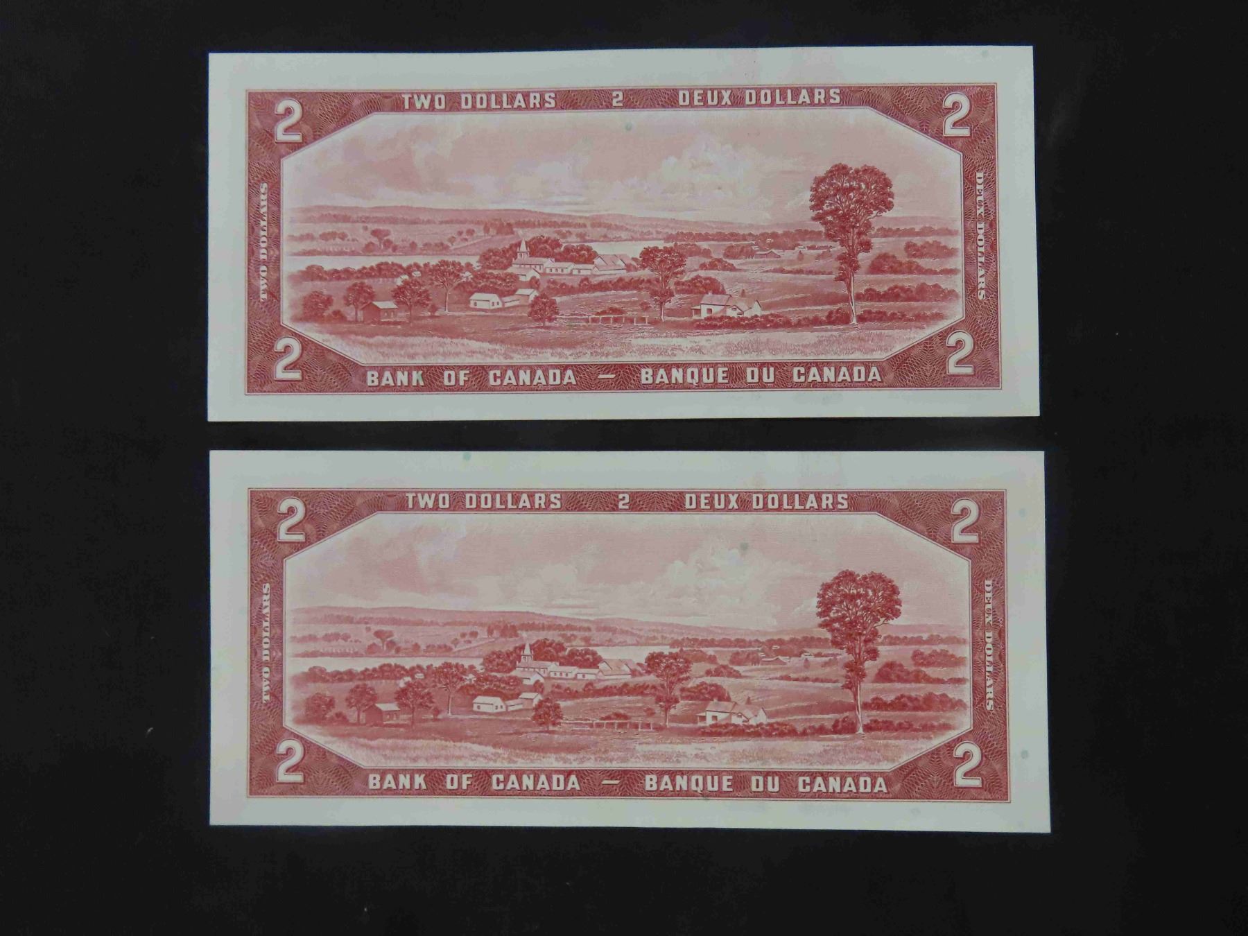 (2) 1954 Canada $2.00 Paper Bills Consecutive Numbers - Oh, So, Crisp