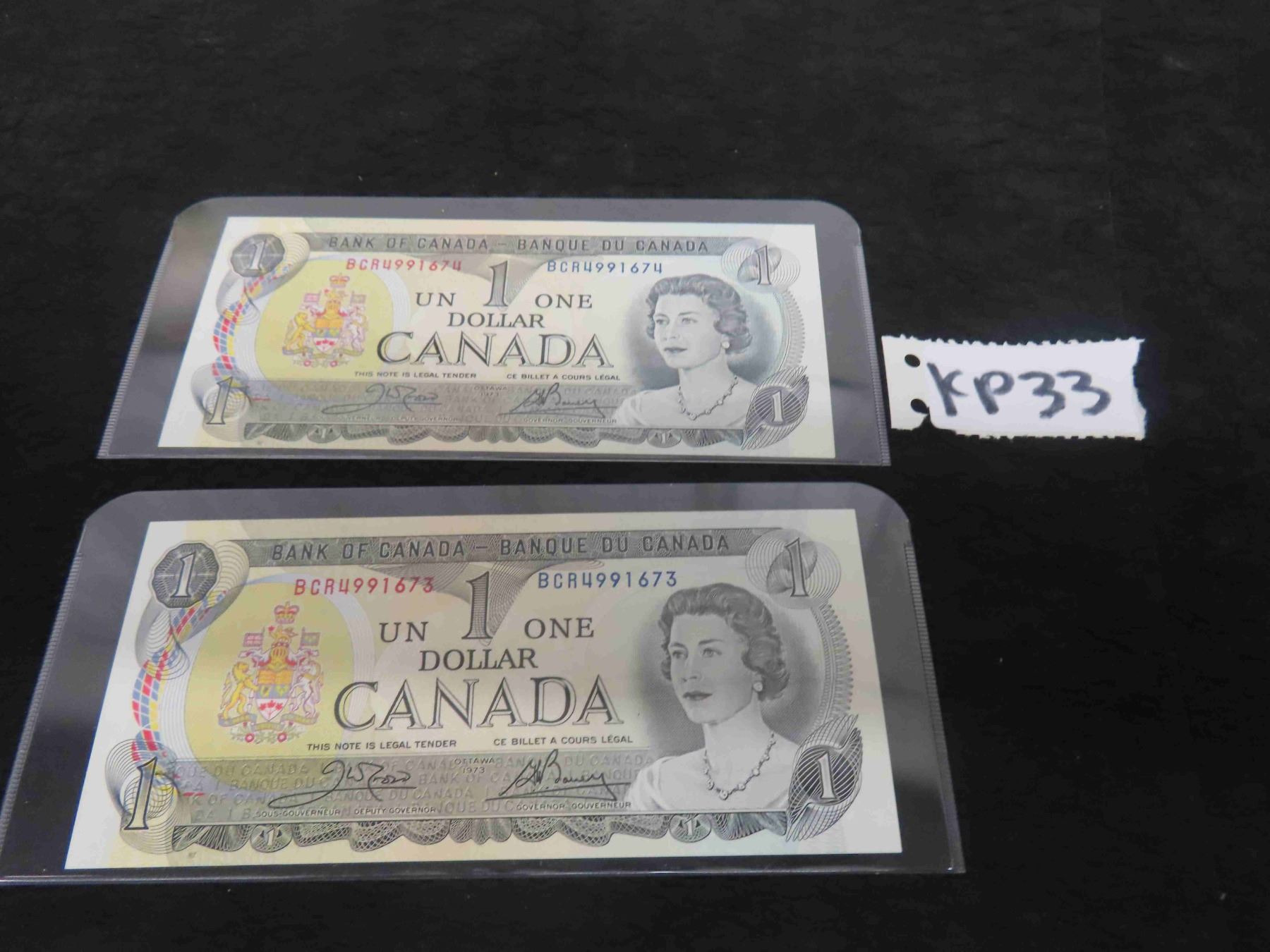 (2) 1973 Canada $1 Bills Uncirculated & Sequential Serial Numbers