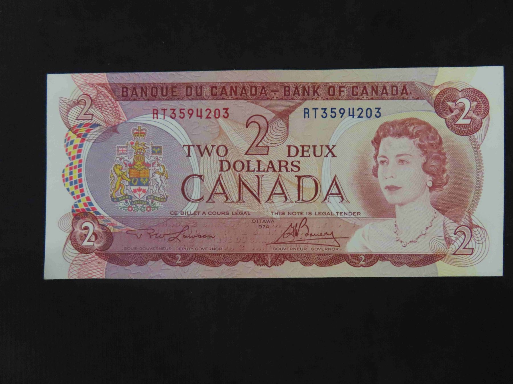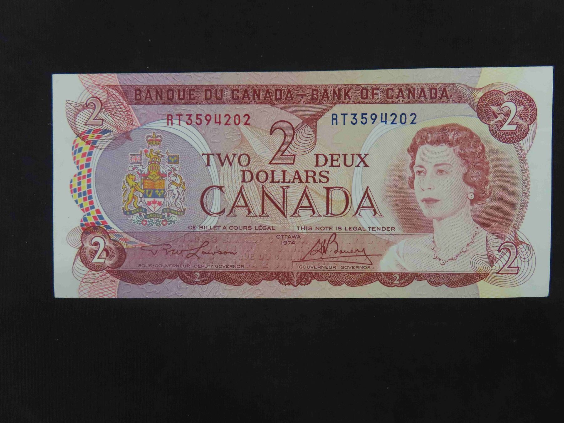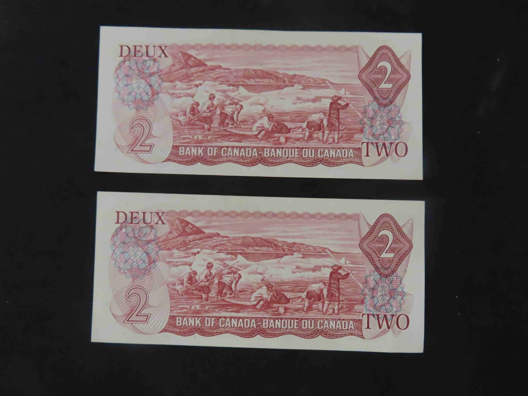 (2) 1974 Canada $2.00 Paper Bills Consecutive Numbers - OH , SO , CRISP
