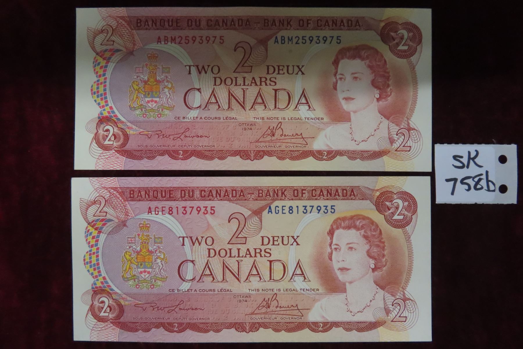 (2) 1974 Canada $2 Bills - Very Nice