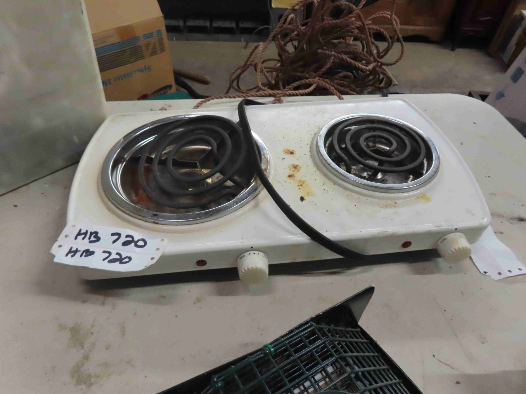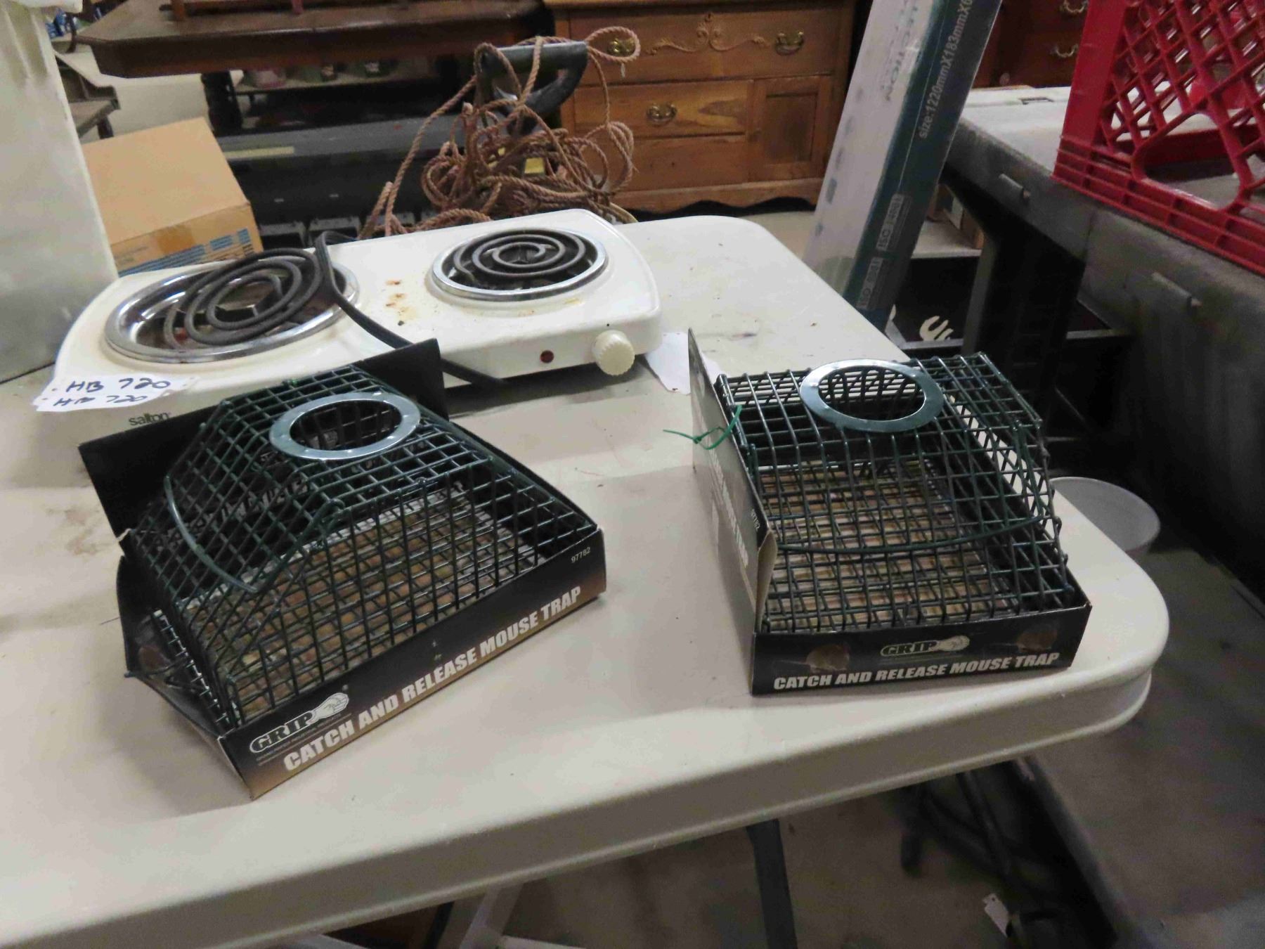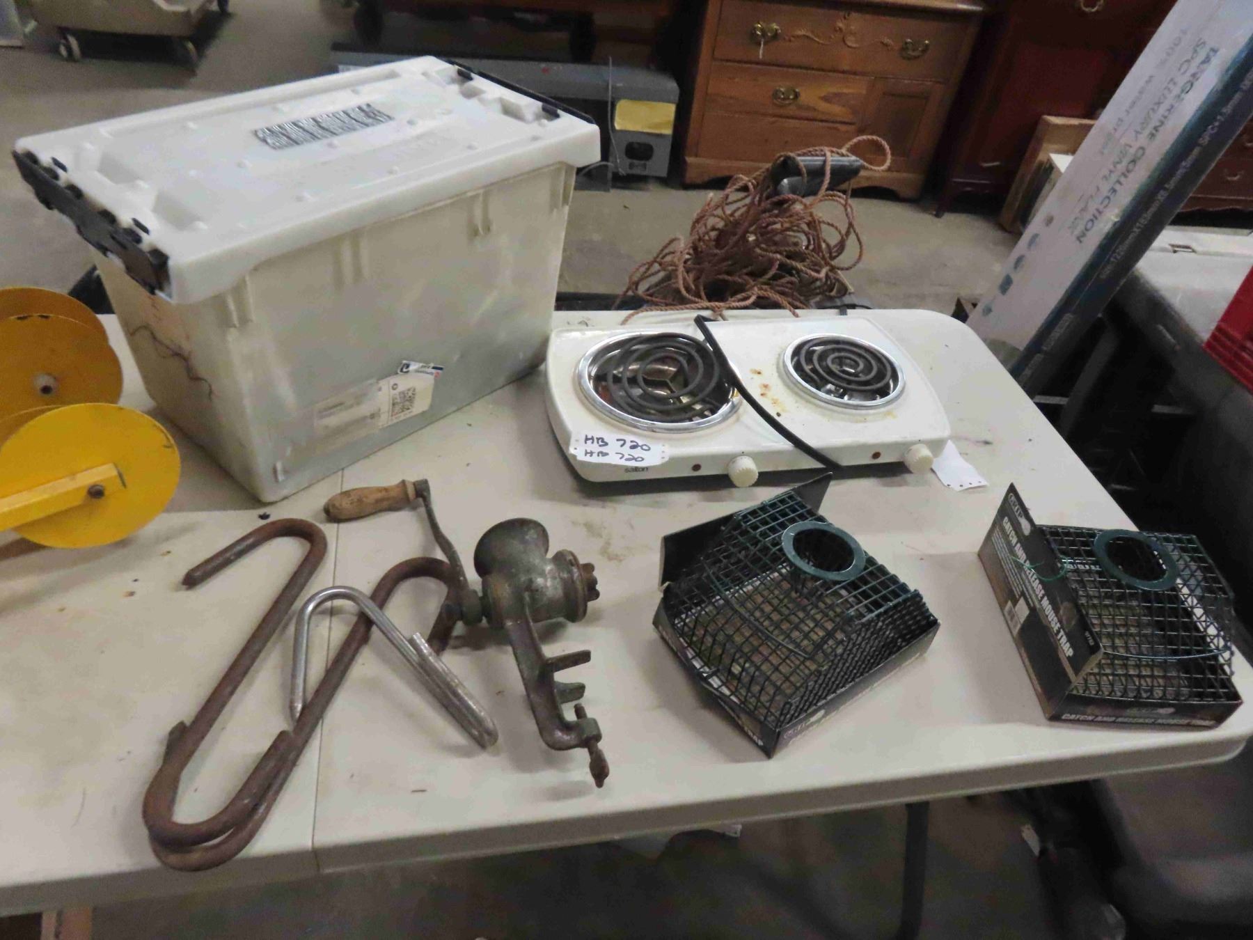 (2) 2 Burner Hot Plate, 3 Meat Hooks, Meat Grinder, 2 New Catch + Release Mouse Traps