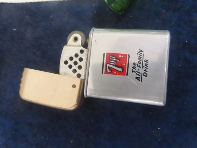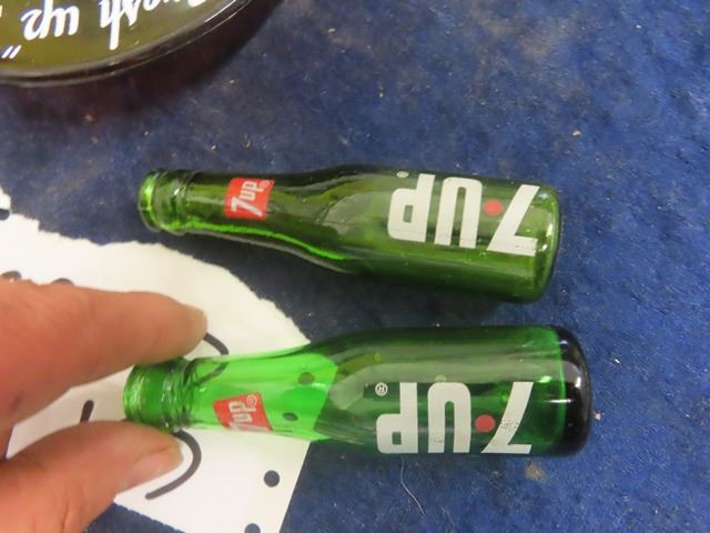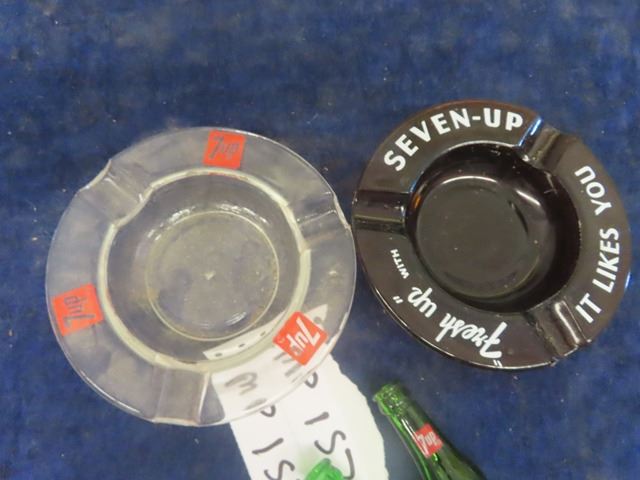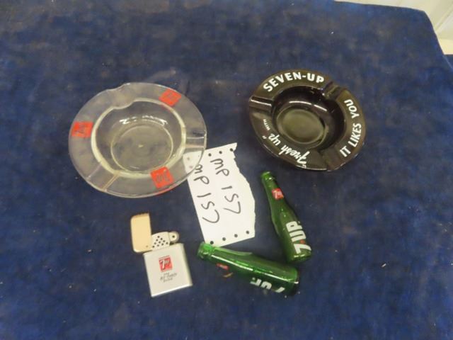 (2) 7 Up Glass Ashtray, 7 Up Lighter, 2 Glass Mini & up Bottles