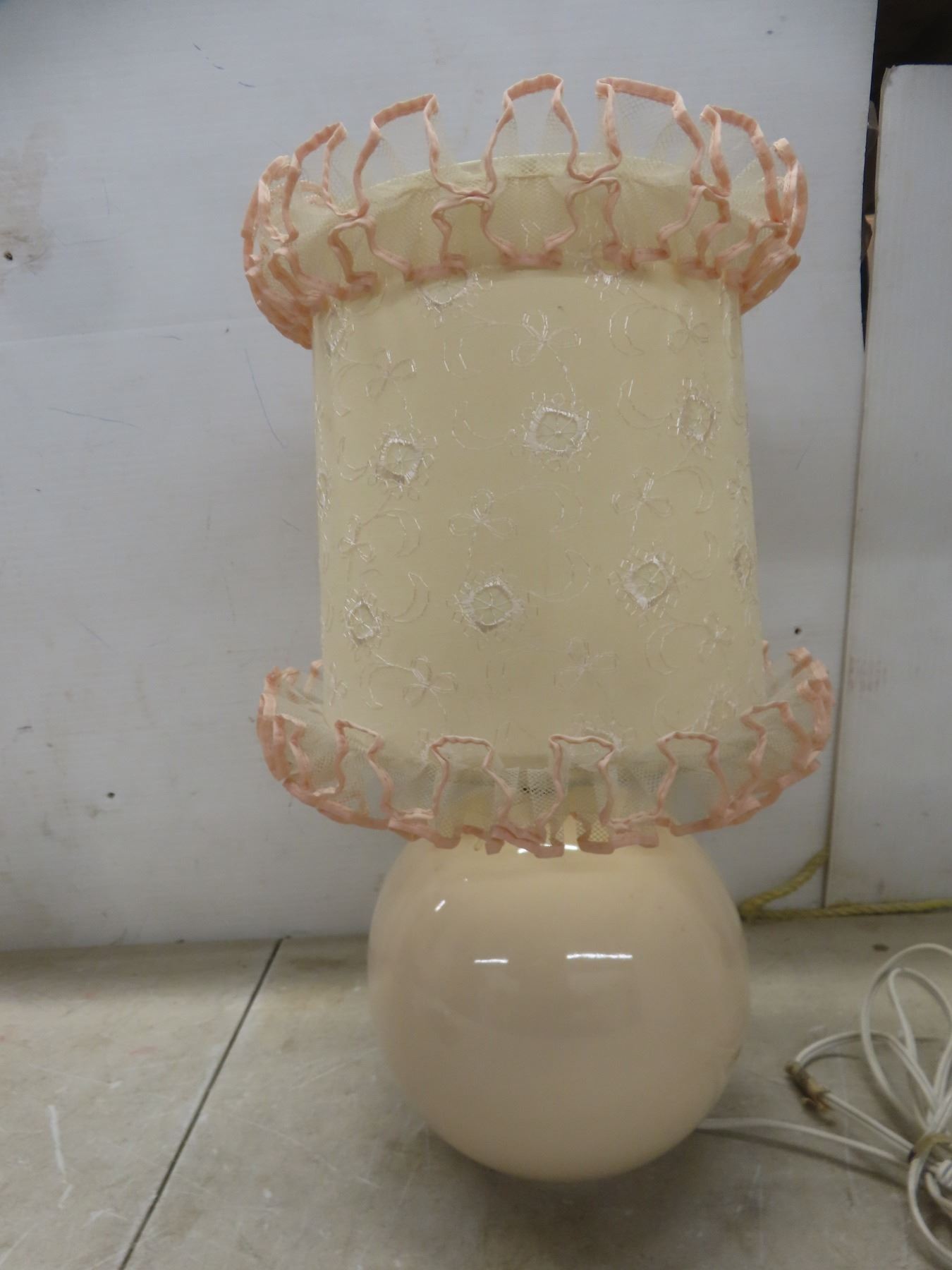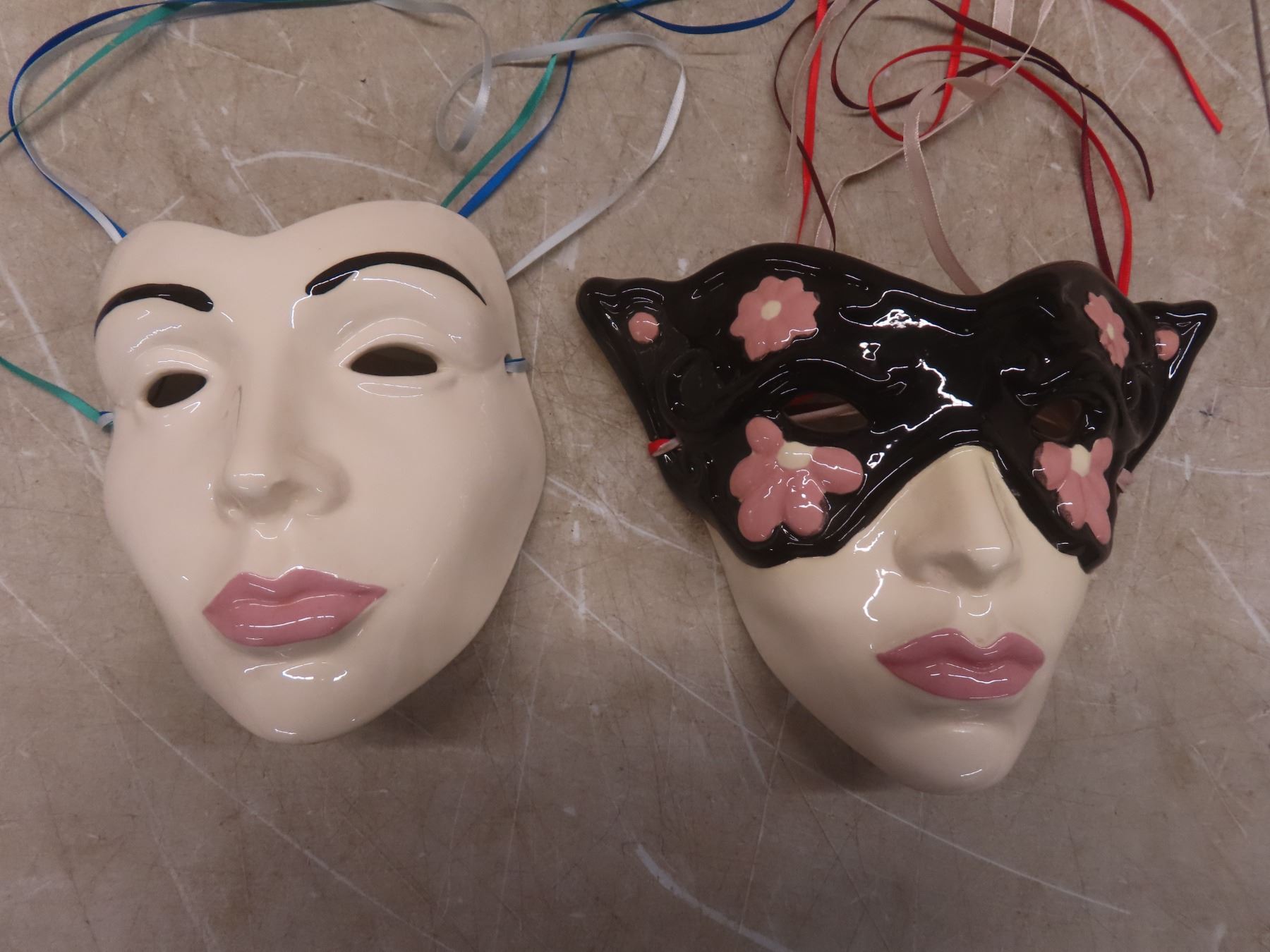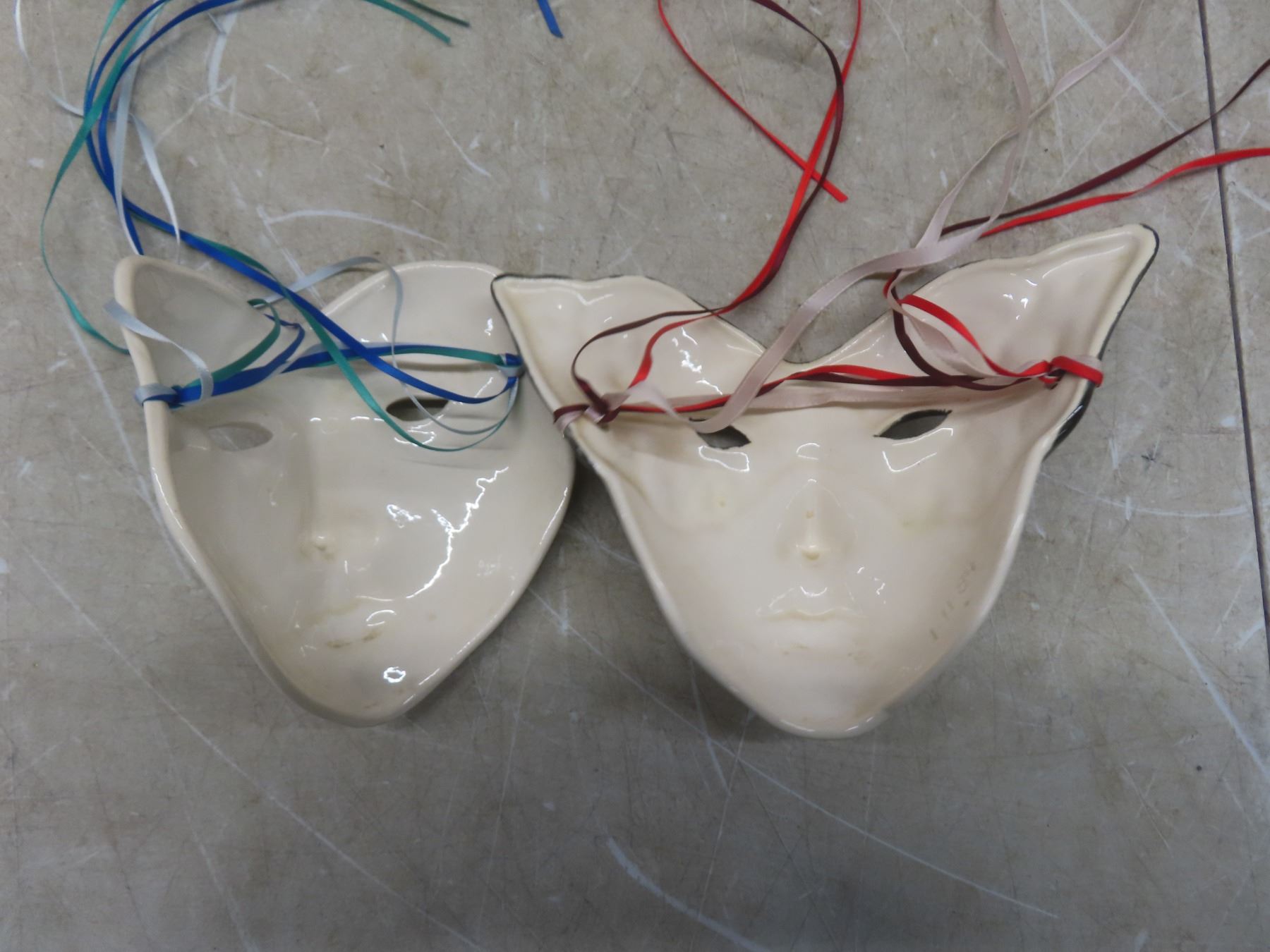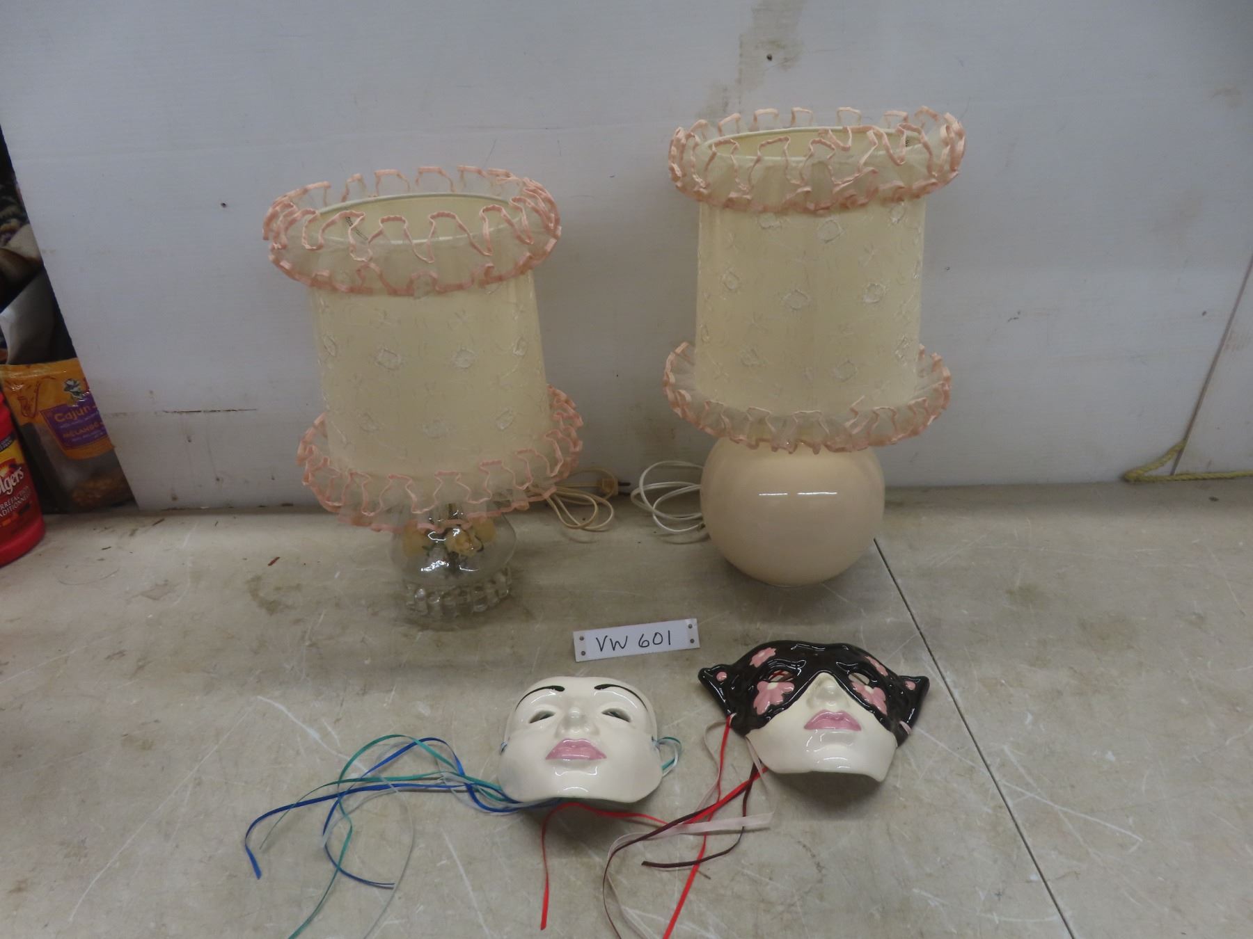 2 Bedside Lamps With Lacy Shades (Tallest 16") And 2 Ceramic Masks.