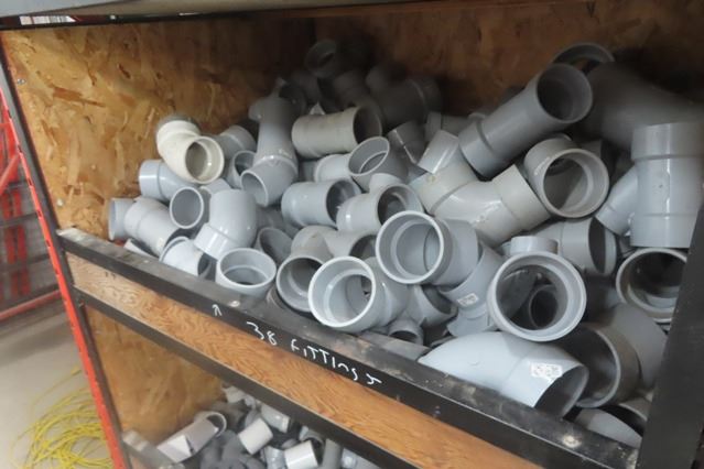 2 Bins of Grey PVC Fittings 3'' - 4 1/2'' Diameter