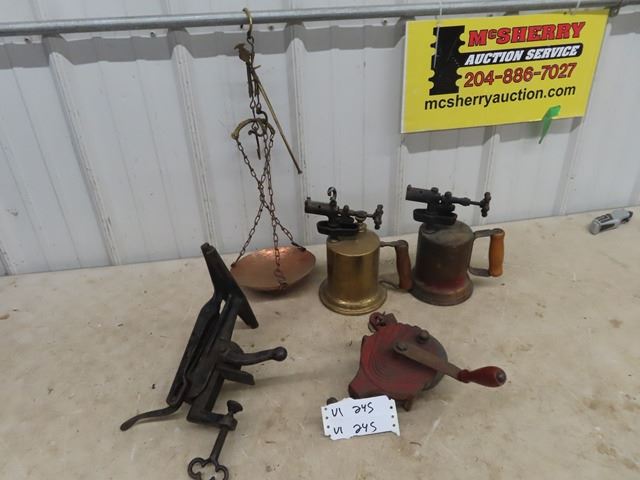 2 Blow Torches, 1) Labelled Coleman, Saw Vice GRinder & Hanging Scale