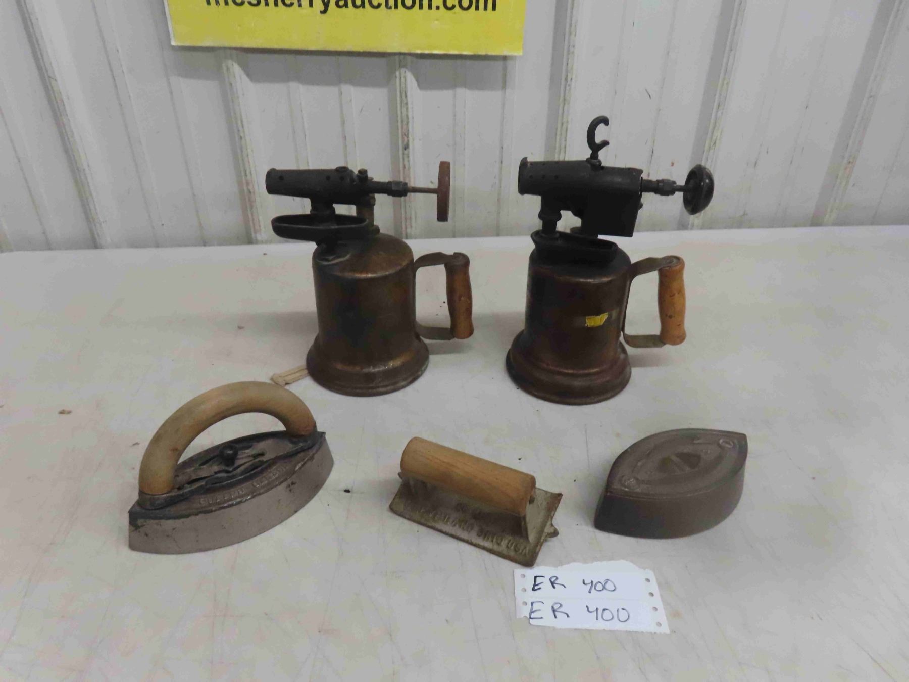 2 Blow Torches, 2 Sad Irons, Hide Scraper