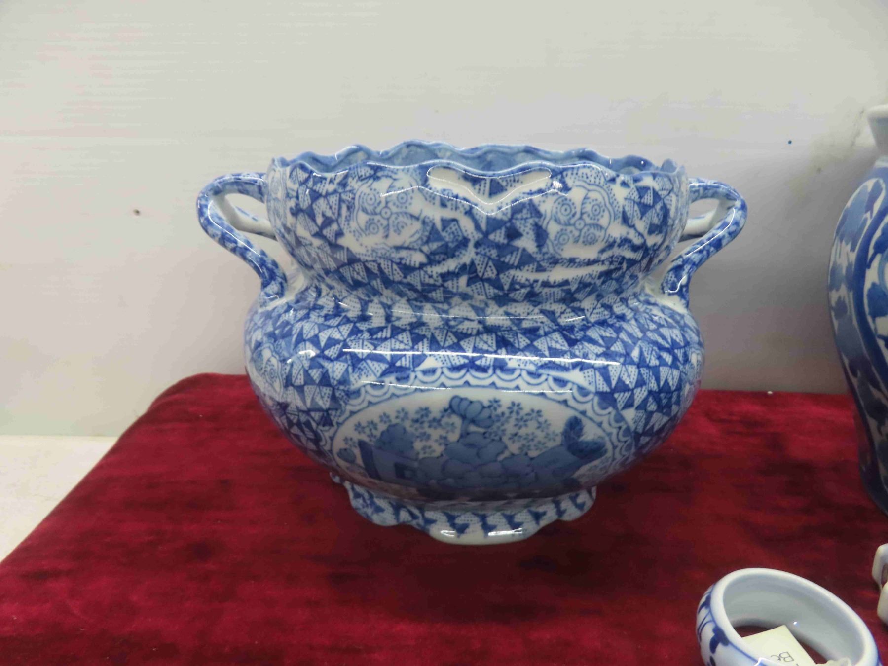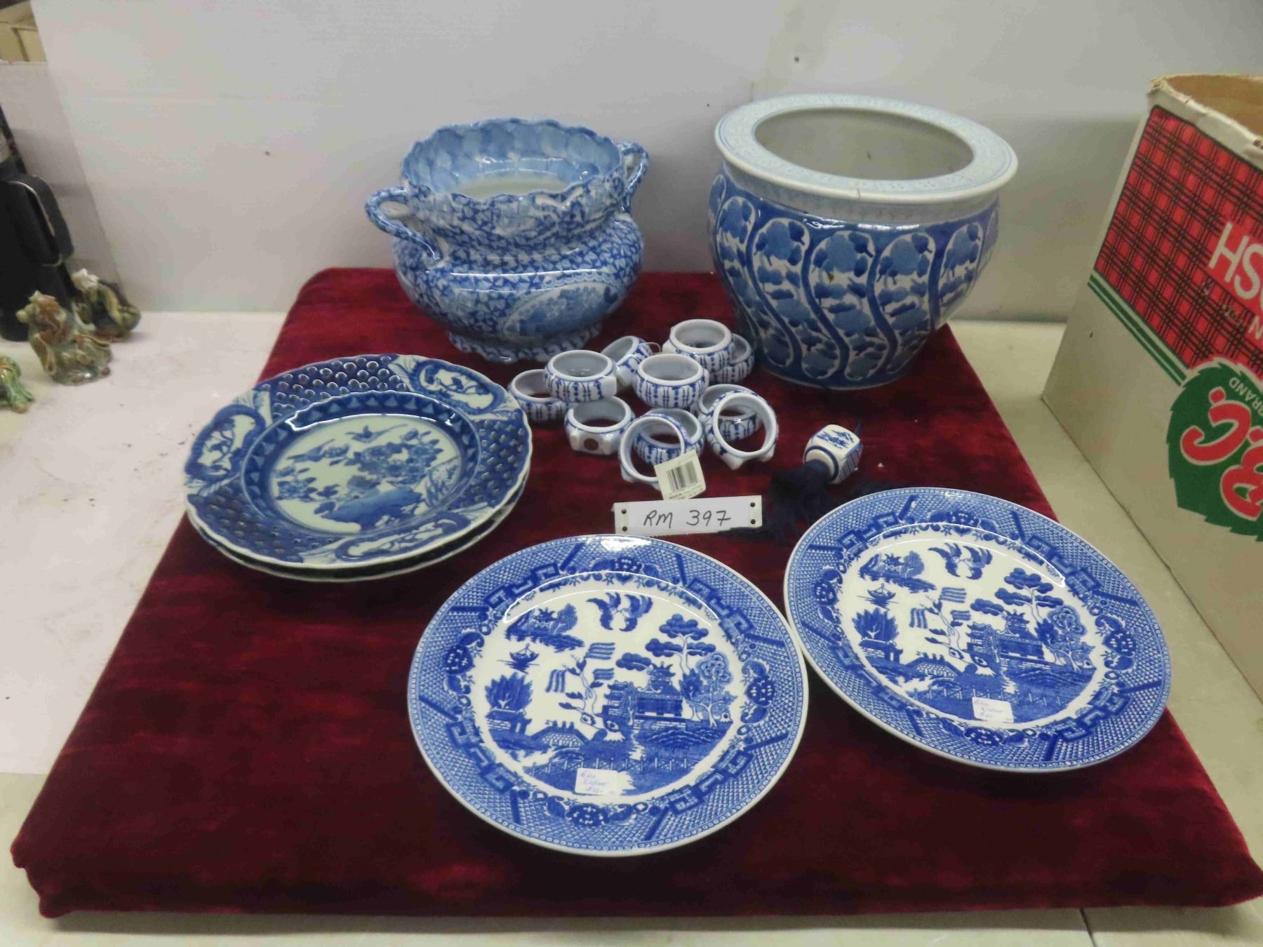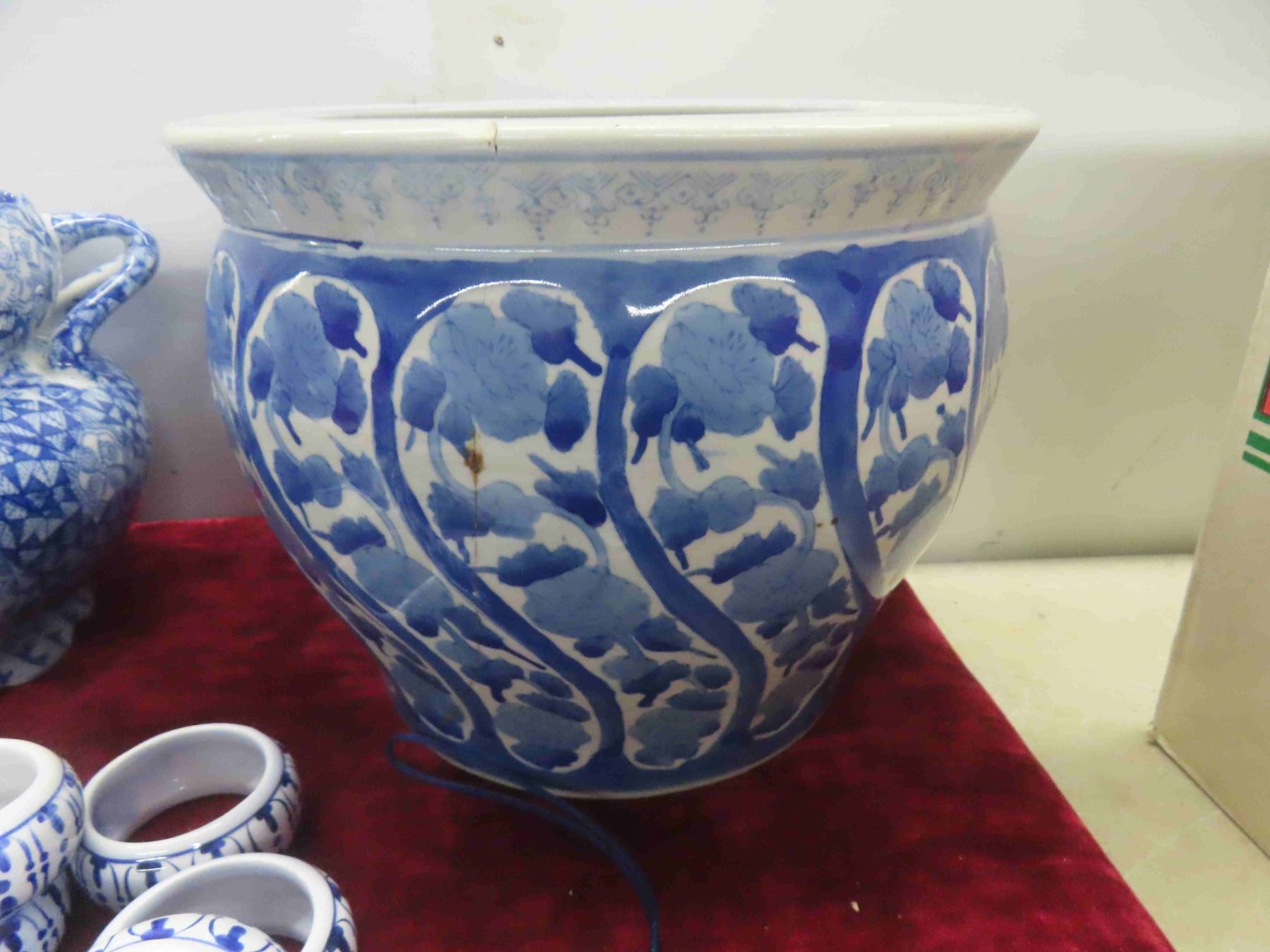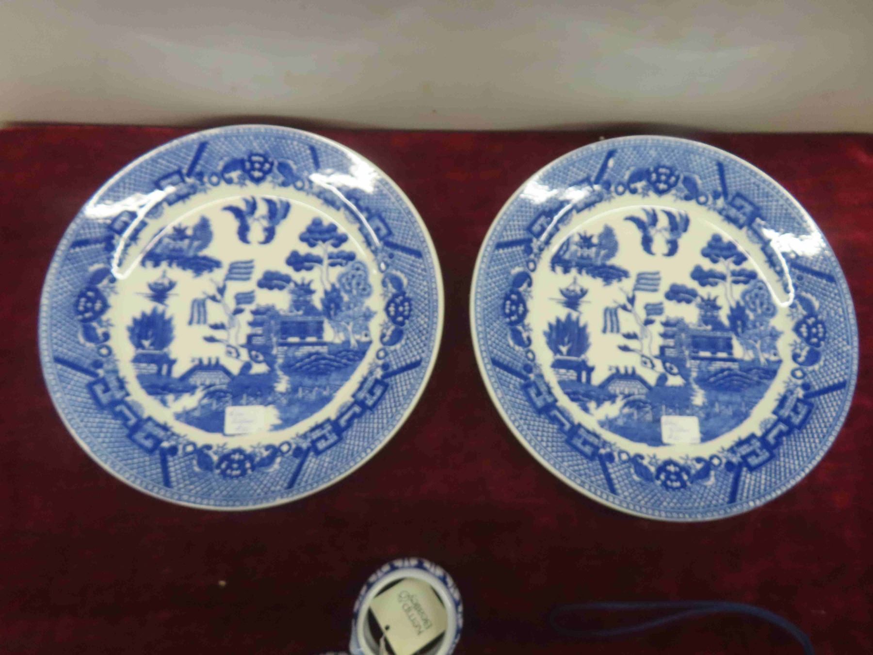 2 Blue Willow Plates, 2 Japanese Blue and White Anita Bird Plates, Napkin Rings Flower Pot (Has Crack, Pictured)