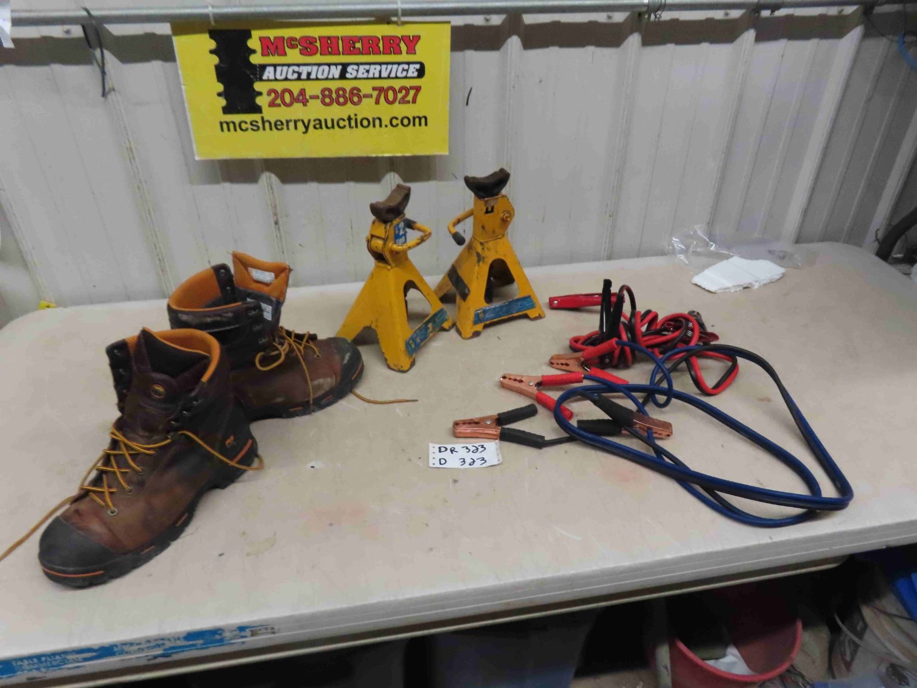 2 Booster Cables, (2) 2 Ton Stabilizing Jacks, Pair of Sz 9.5 Work Boots