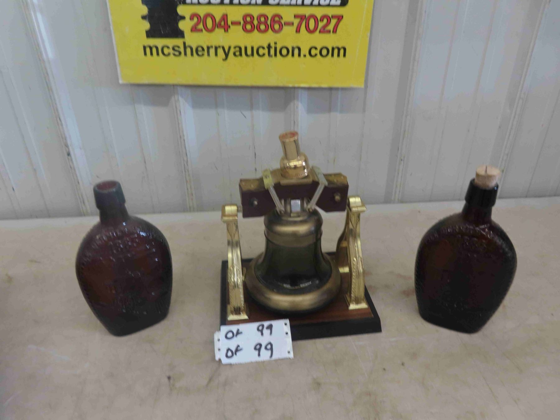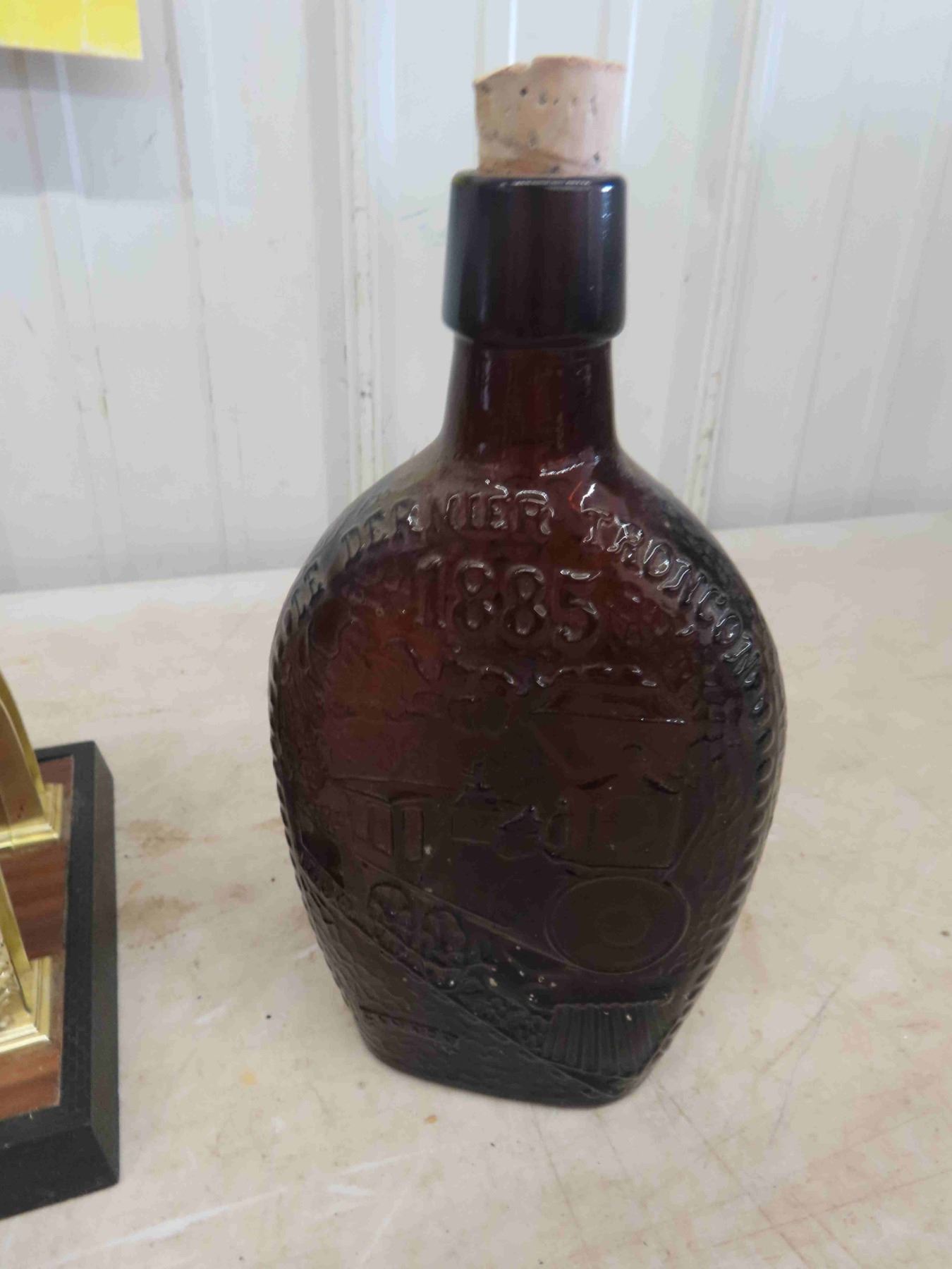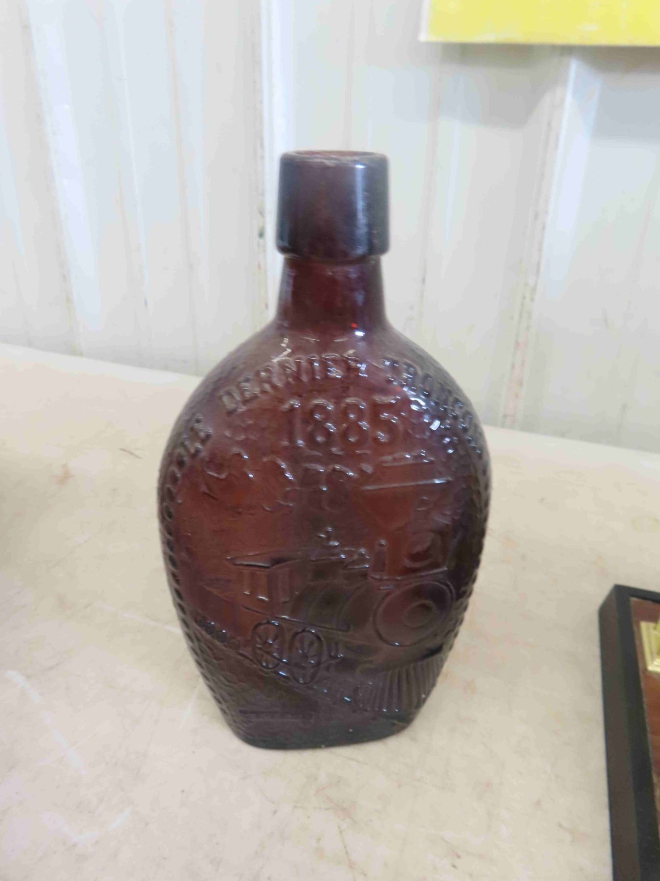 2 Booze Bottles - Embossed ; 1885 with Iron Train + Liberty Bell Decanter