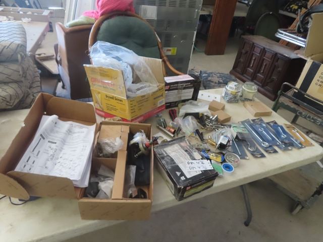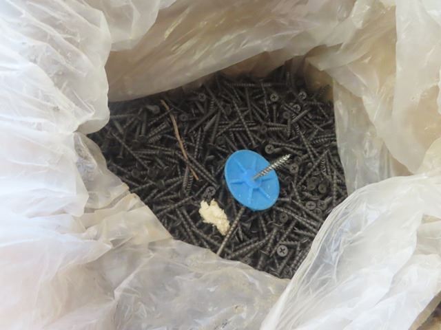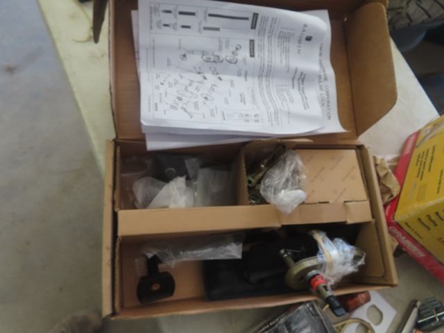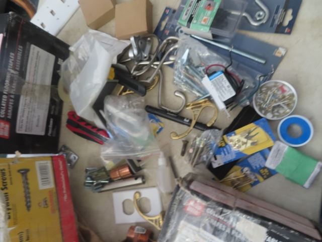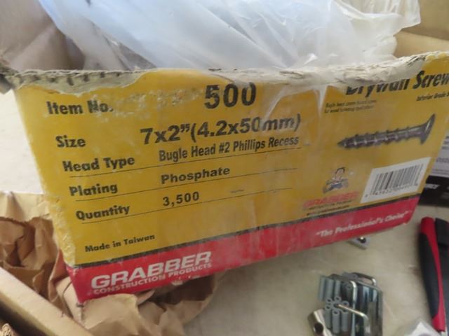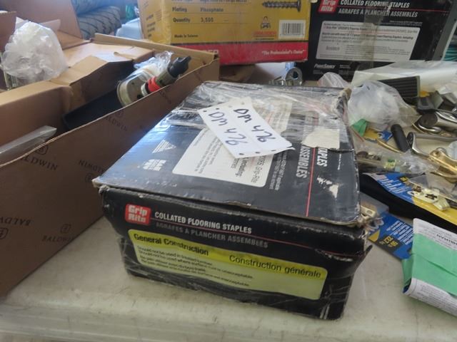 2 Boxes Flooring Staples, Baldwin Door Handles, 2/3 Box of Drywall Screws, Various Hardwares , Wall
