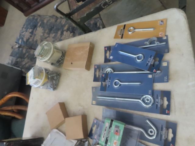 2 Boxes Flooring Staples, Baldwin Door Handles, 2/3 Box of Drywall Screws, Various Hardwares , Wall Hooks
