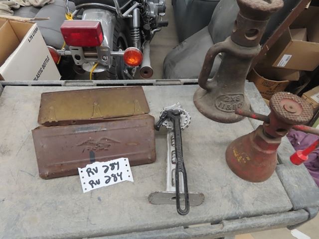 2 Building Jacks, Metal Mail Box w Embossed Eagle, & Old Auto Jack