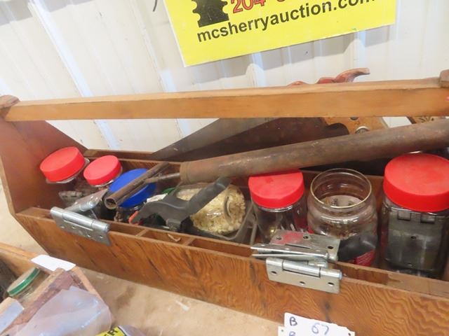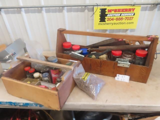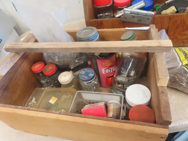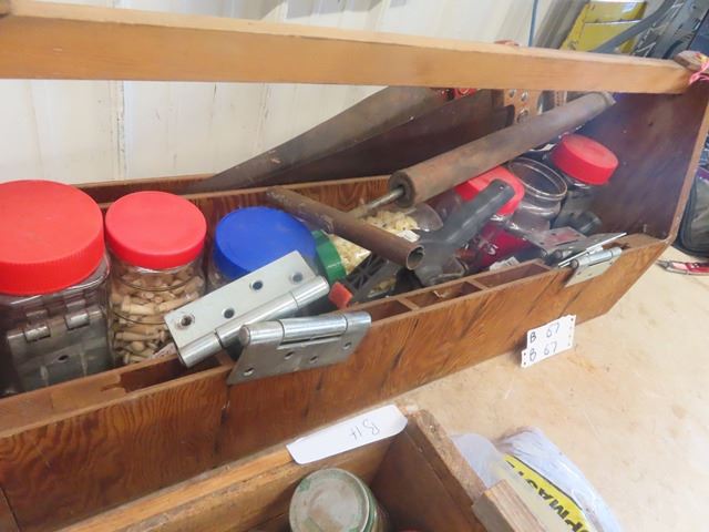 2 Carpenters Boxes Full of Hardware + Hand Tools; Nails, Screws, Saws, Hinges, Clamps plus more