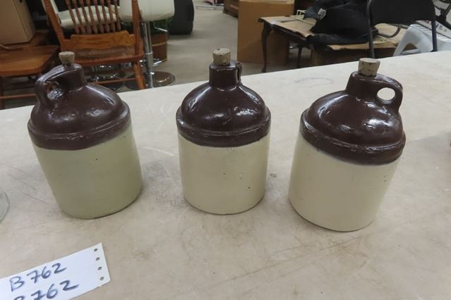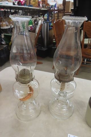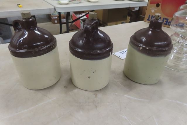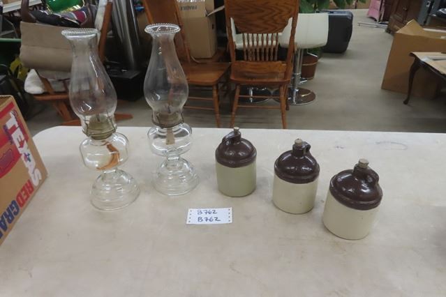 2 Clear Oil Lamps, 3 Crock Style Display Jugs