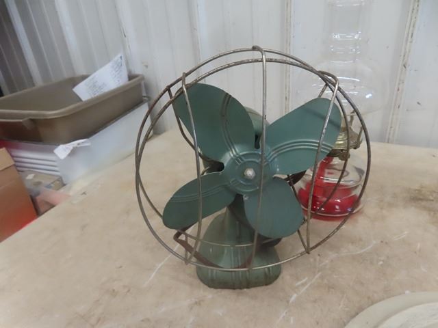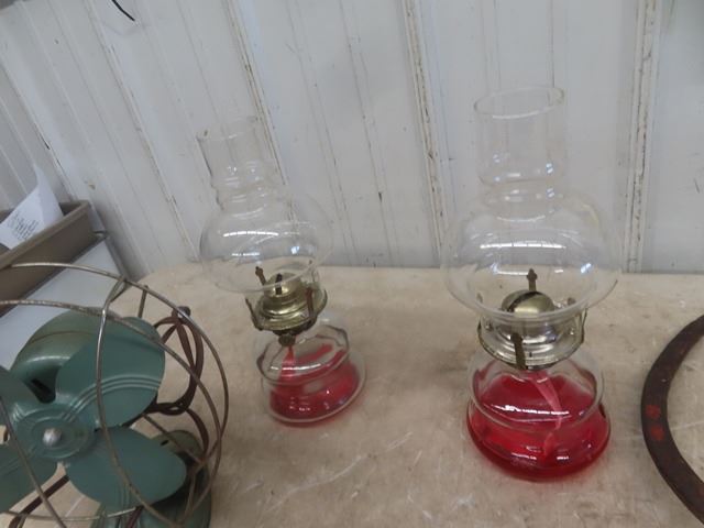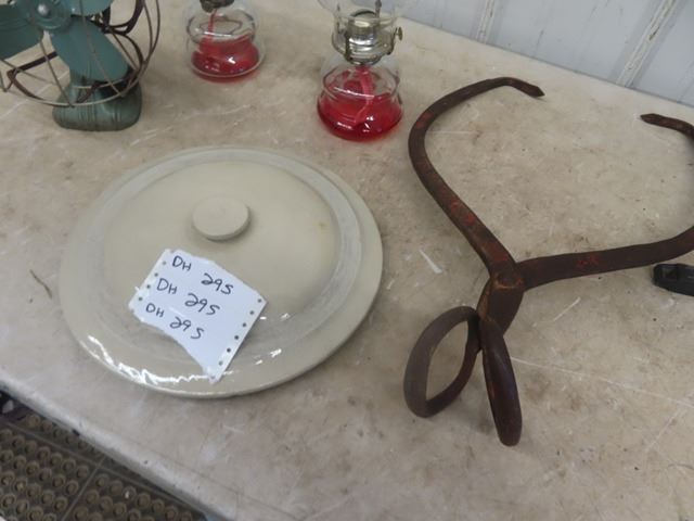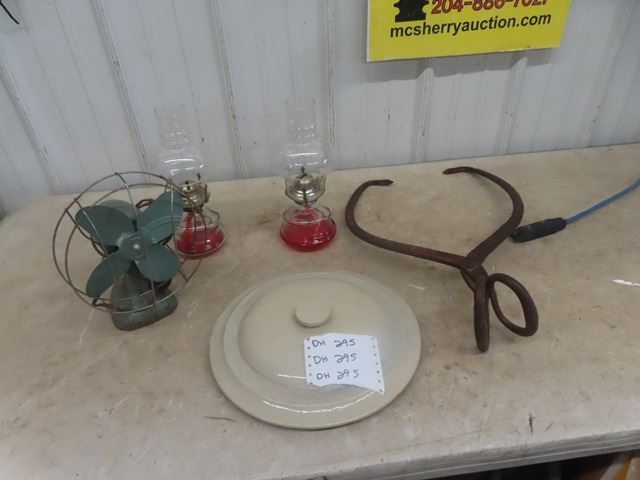 2 Coal Oil Lamps, 5 Gal Crock Lid, Vintage Fan, Ice Tongs