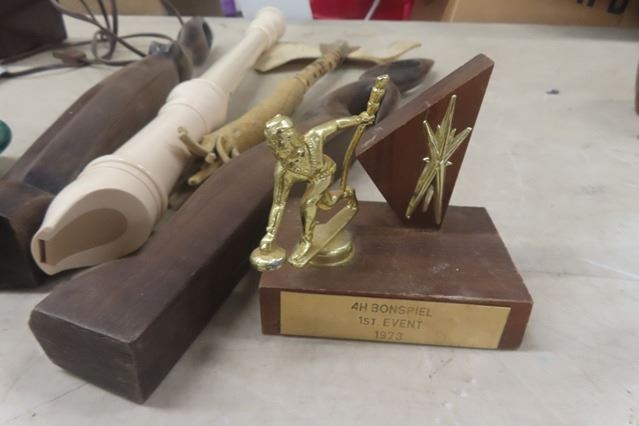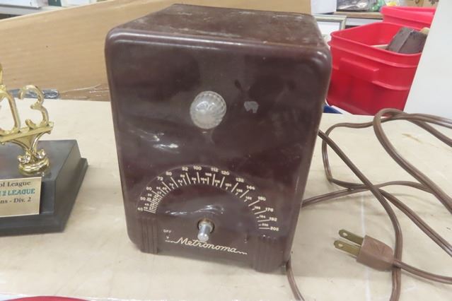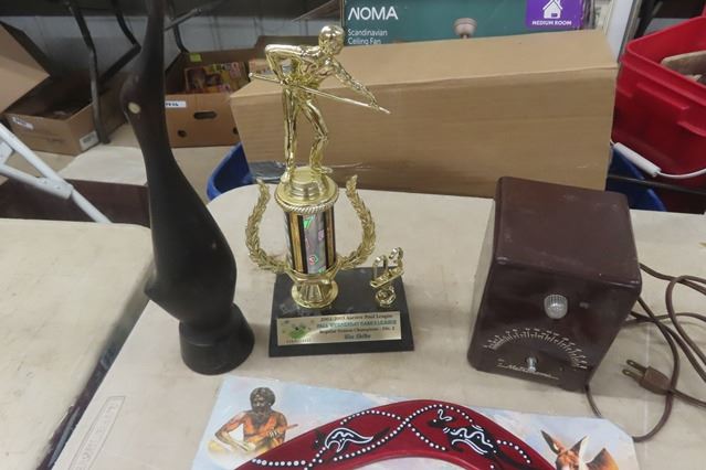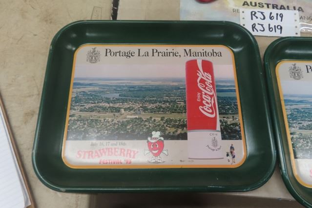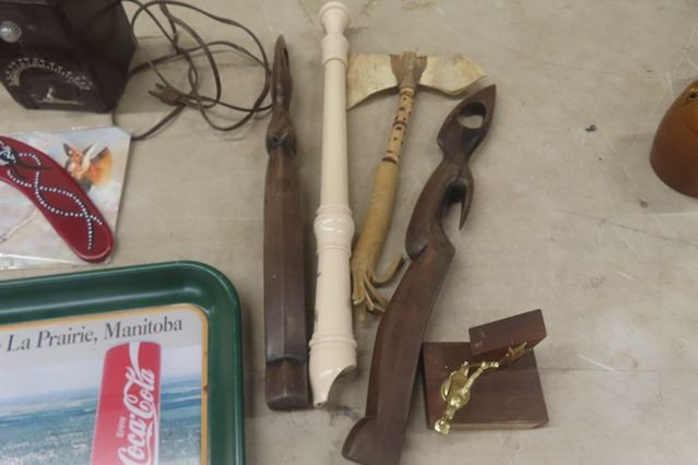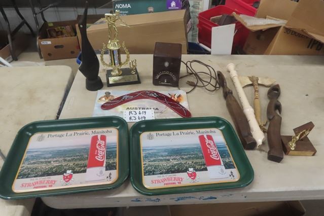 2 Coca-Cola Portage La Prairie Trays, 2 Trophys, Metronome, Wood Carved Figures plus more