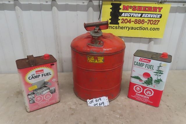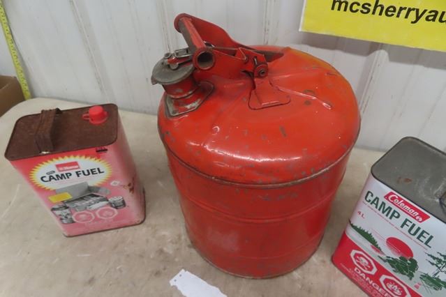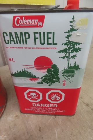2 Coleman Camp Fuel Tins 4L- 1 with Product + Fuel Safety Can