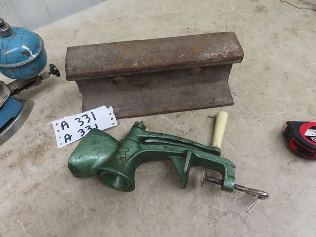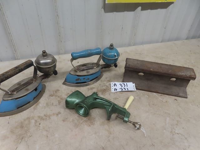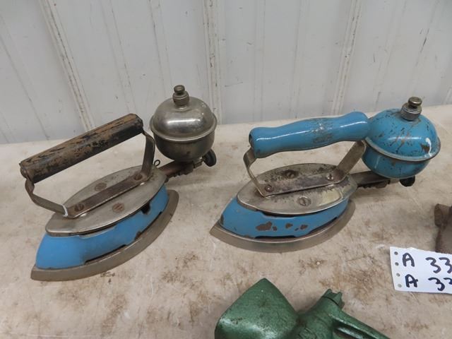 2 Coleman Gas Irons & Rail Line Anvil & Grinder