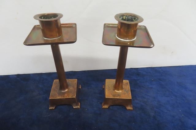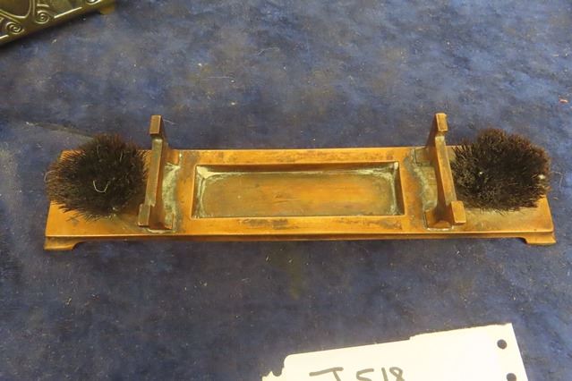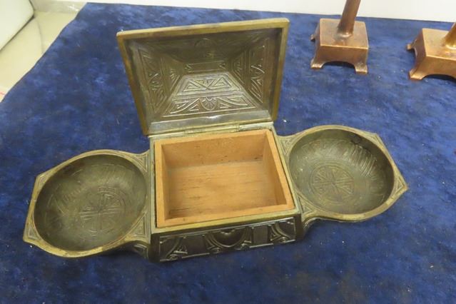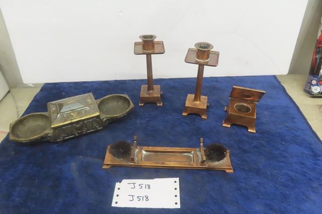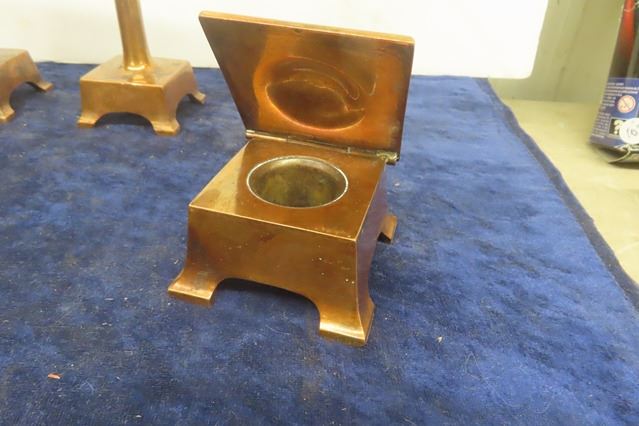 2 Copper Candle Holders, Brass Ink Well, Brass Quill Rest, Brass Smoking Set?