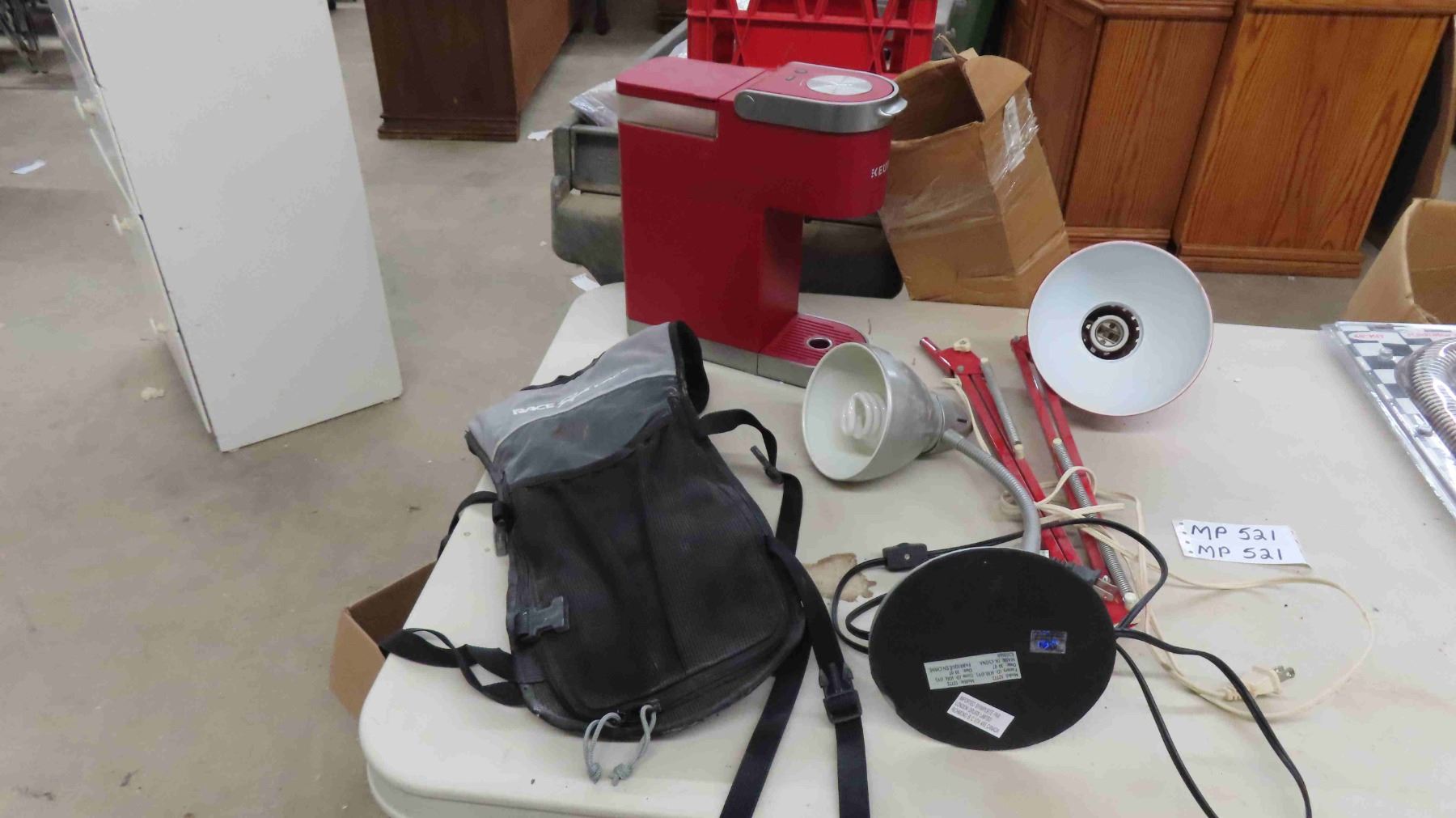 2 Desk Lamps, Keurig Coffee Machine, Race Face Back Pack