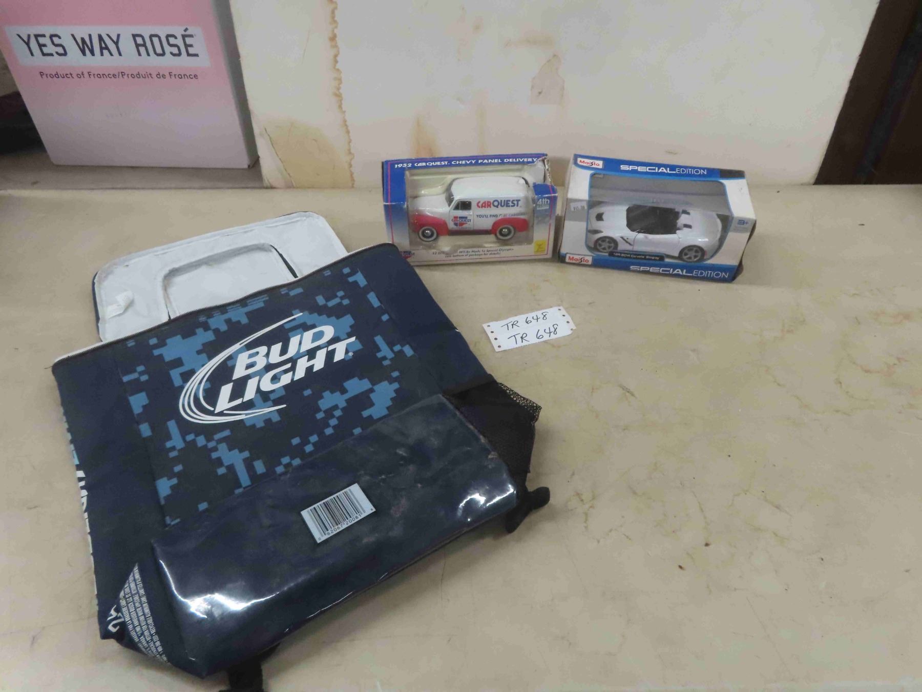 2 Die Cast 1:24 Scale ; 1952 Chevy Panel Delivery & 2014 Vette & Bud Light Backpack Beer Carrier