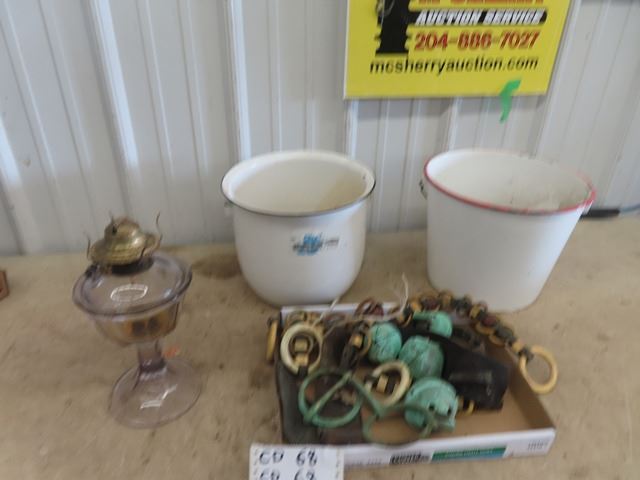 2 Enamel Slop Pails, Coal Oil Lamp, Spread RIngs, Brass & Sleigh Bells, Need a Cleaning