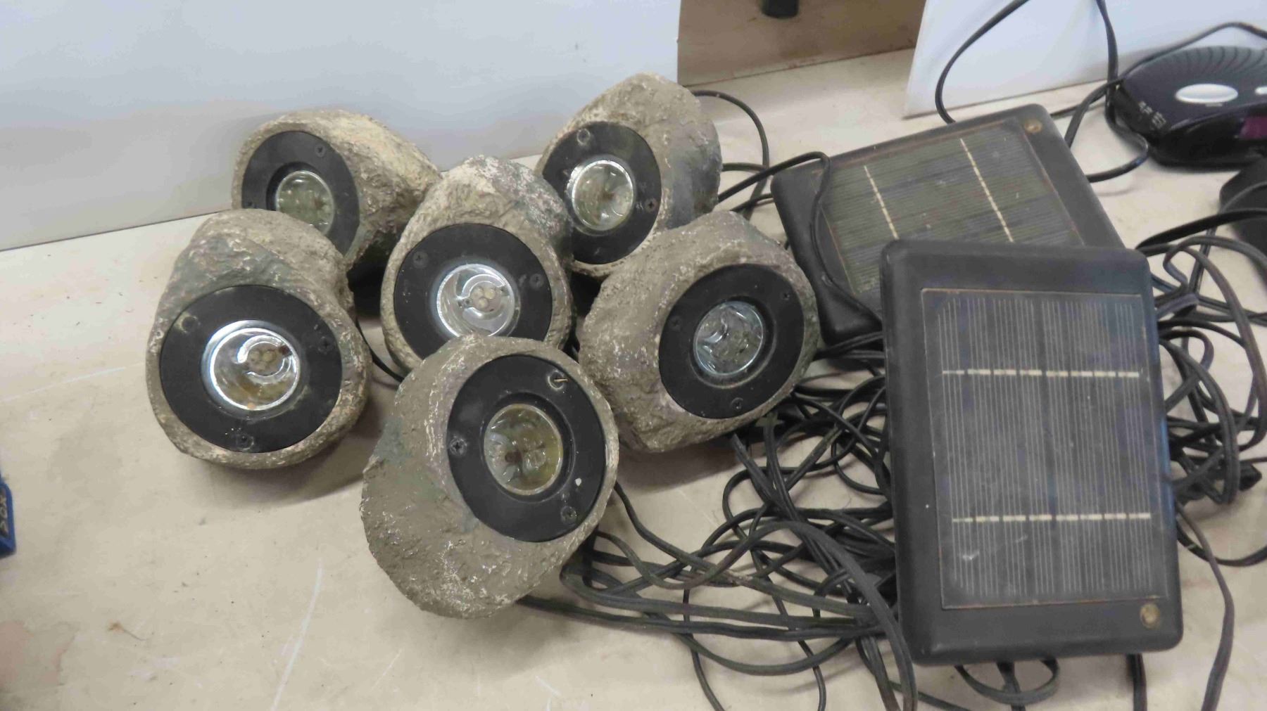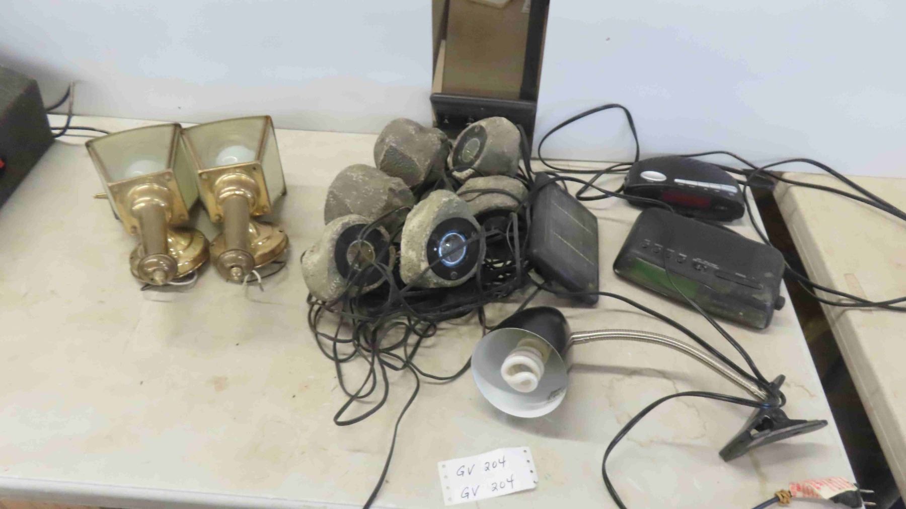 2 Exterior Wall Light Pictures, 6 Solar Rock Lights, 2 Clock Radios