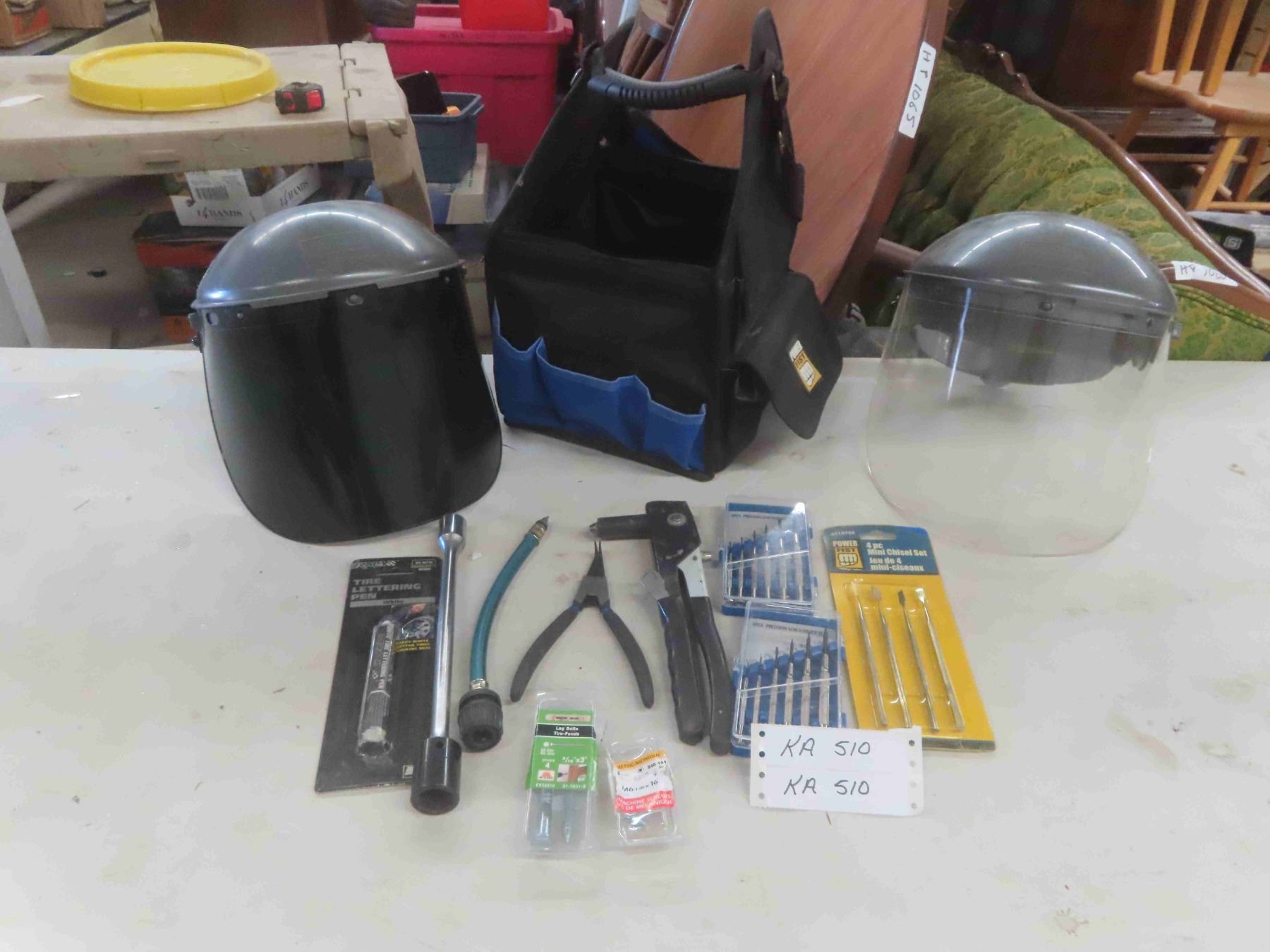 2 Face Shields, Power Fist Tool Carry All , Precision Screwdrivers, Pop Rivot Gun, Pliers & More