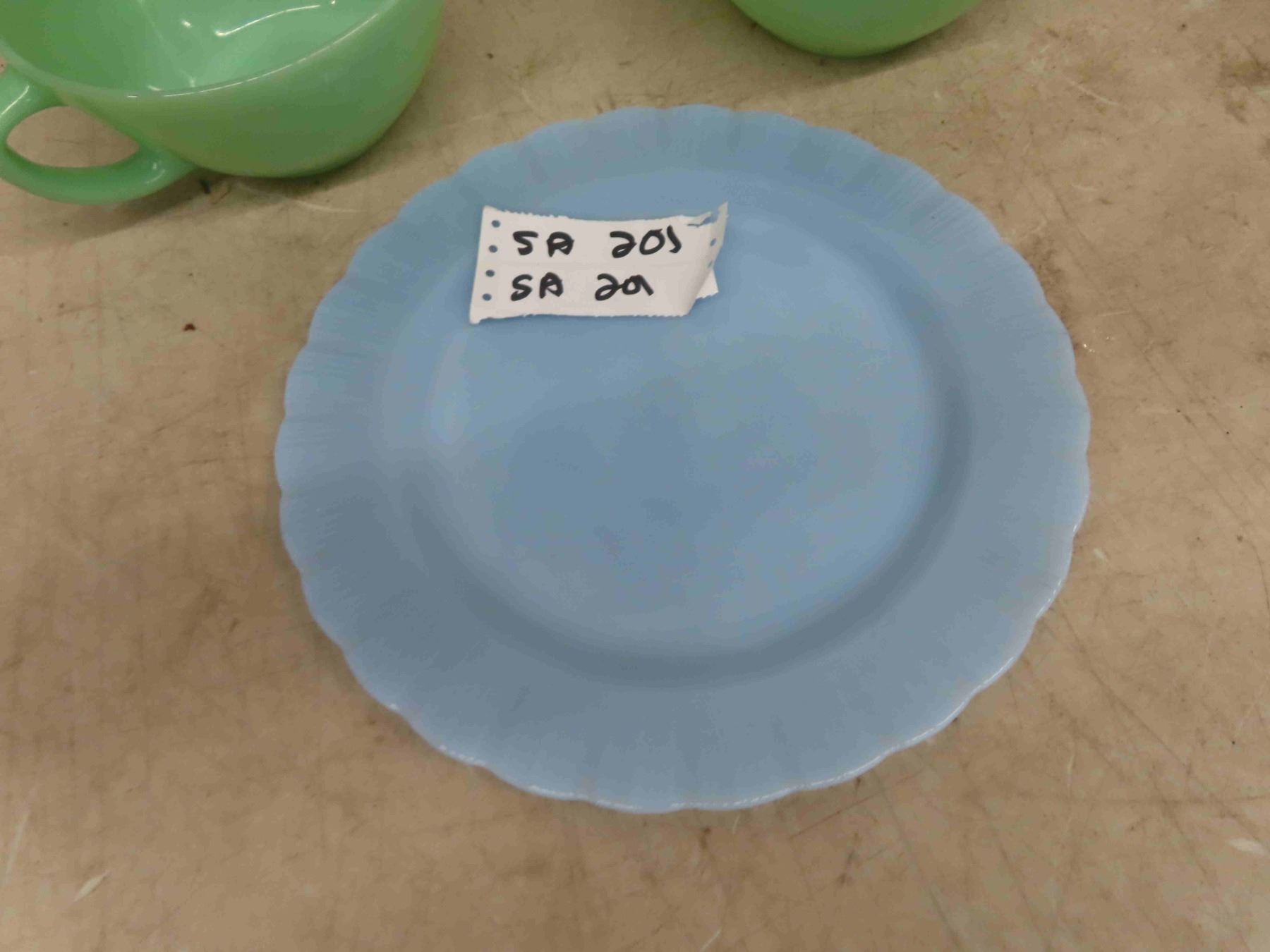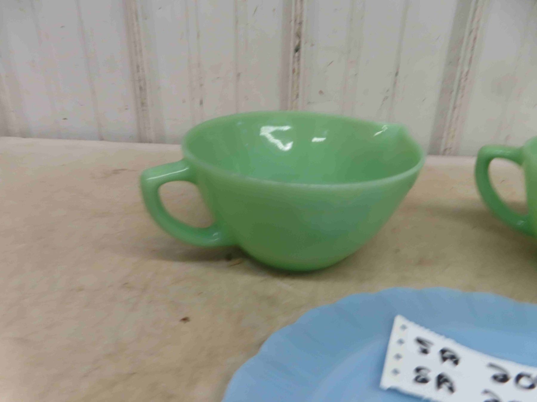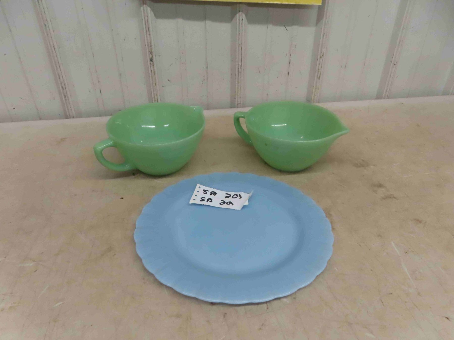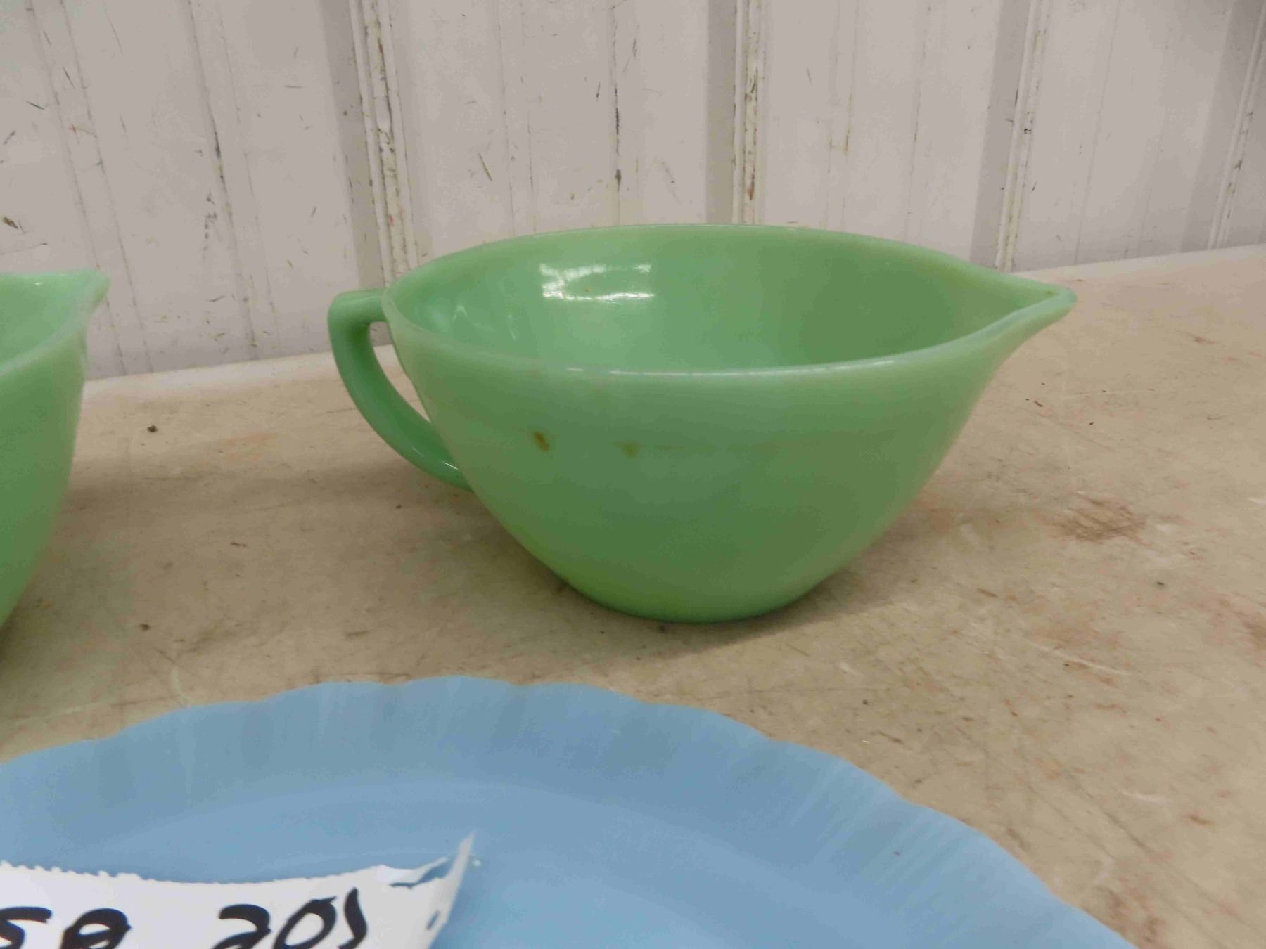 2 Fire King Jadeite Mixing Bowls with Handle + Pour Lip & Pyrex Delphite Plate