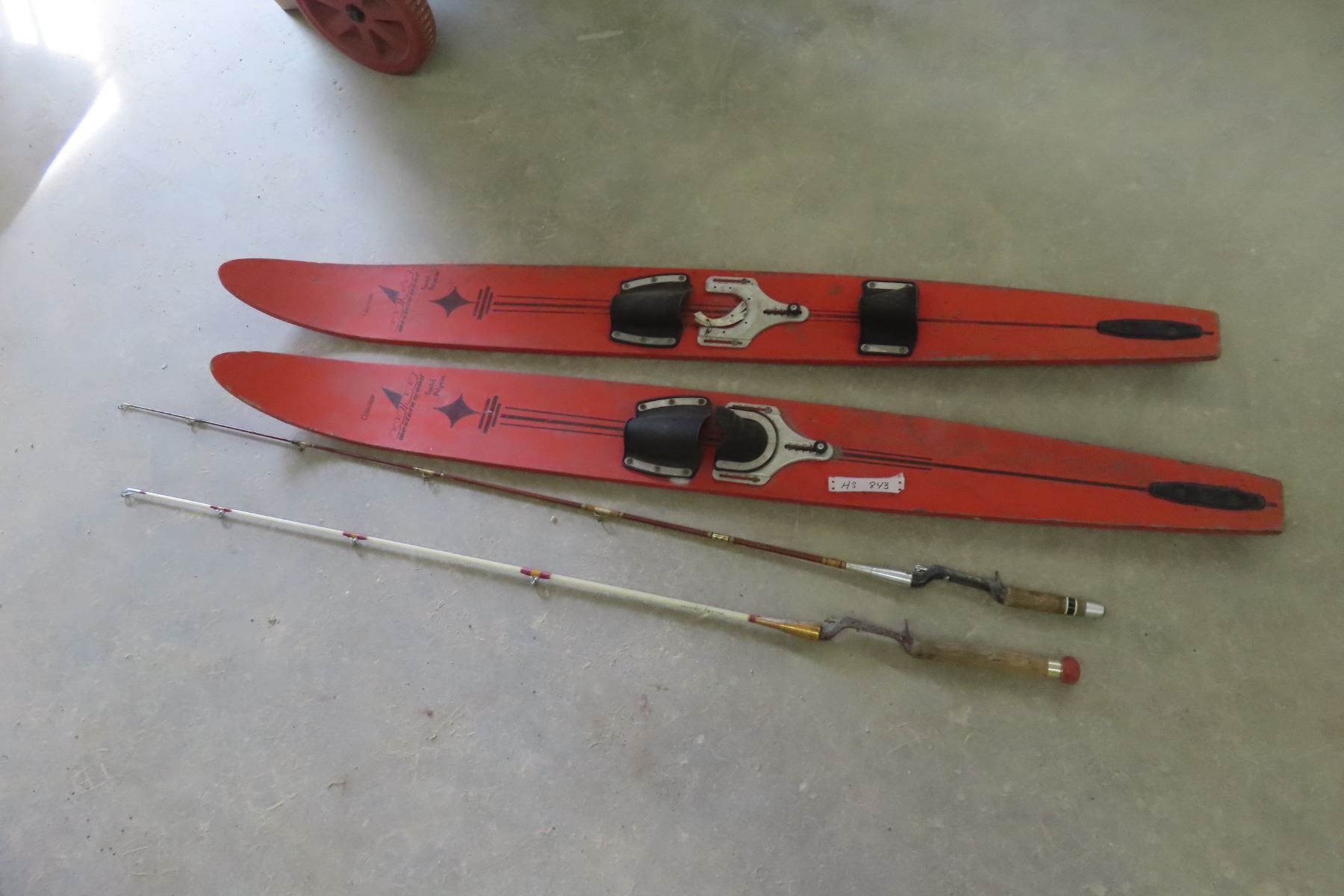 2 Fishing Rods + 2 Caprice Western Wood Water Skis