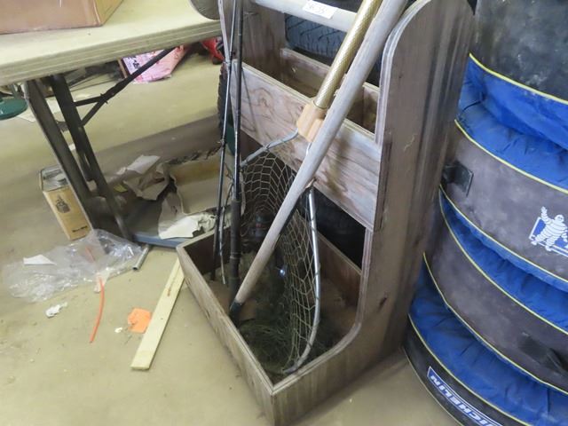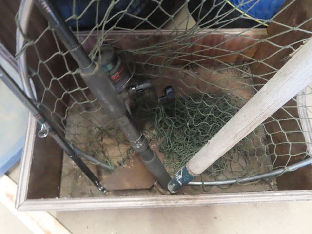 2 Fishing Rods, Fishing Net, Garden Hoe, Wooden Yard Shed Organizer