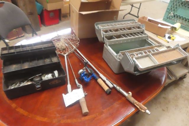 2 Fishing Tackle Boxes, Rod, Reel, Net + Some hooks