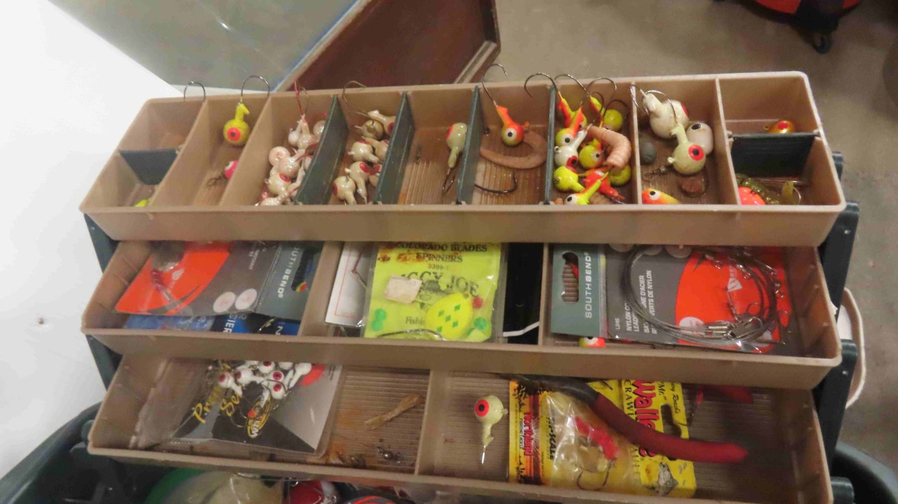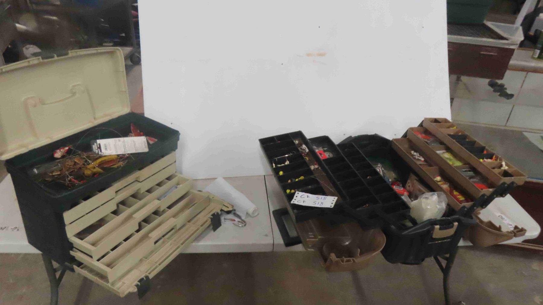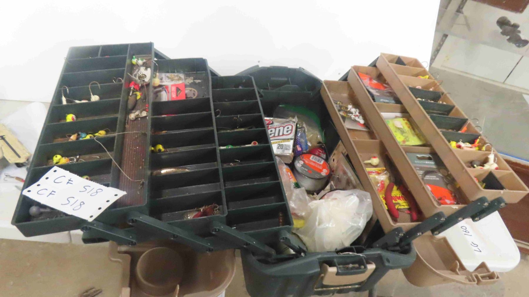 2 Fishing Tackle Boxes with Product: Fishing Line, Hooks, Lures, Jigs