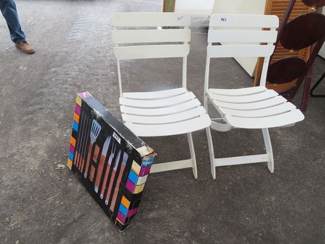 2 Folding White Plastic Chairs w New BBQ Utensil Set