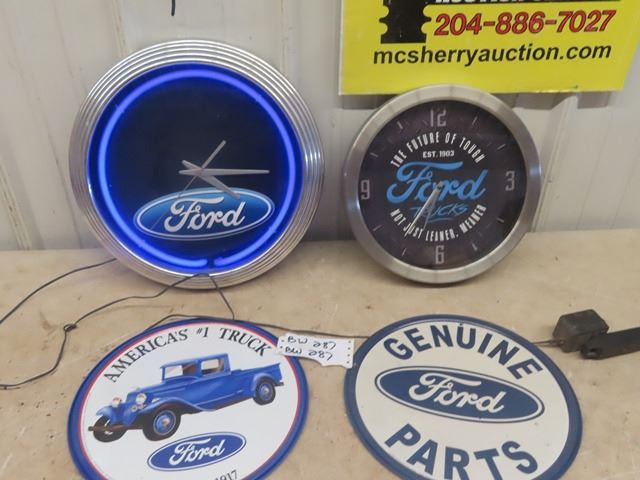 2 Ford Clocks; 1) Neon 15" Wide, & 2 Metal Modern For Signs