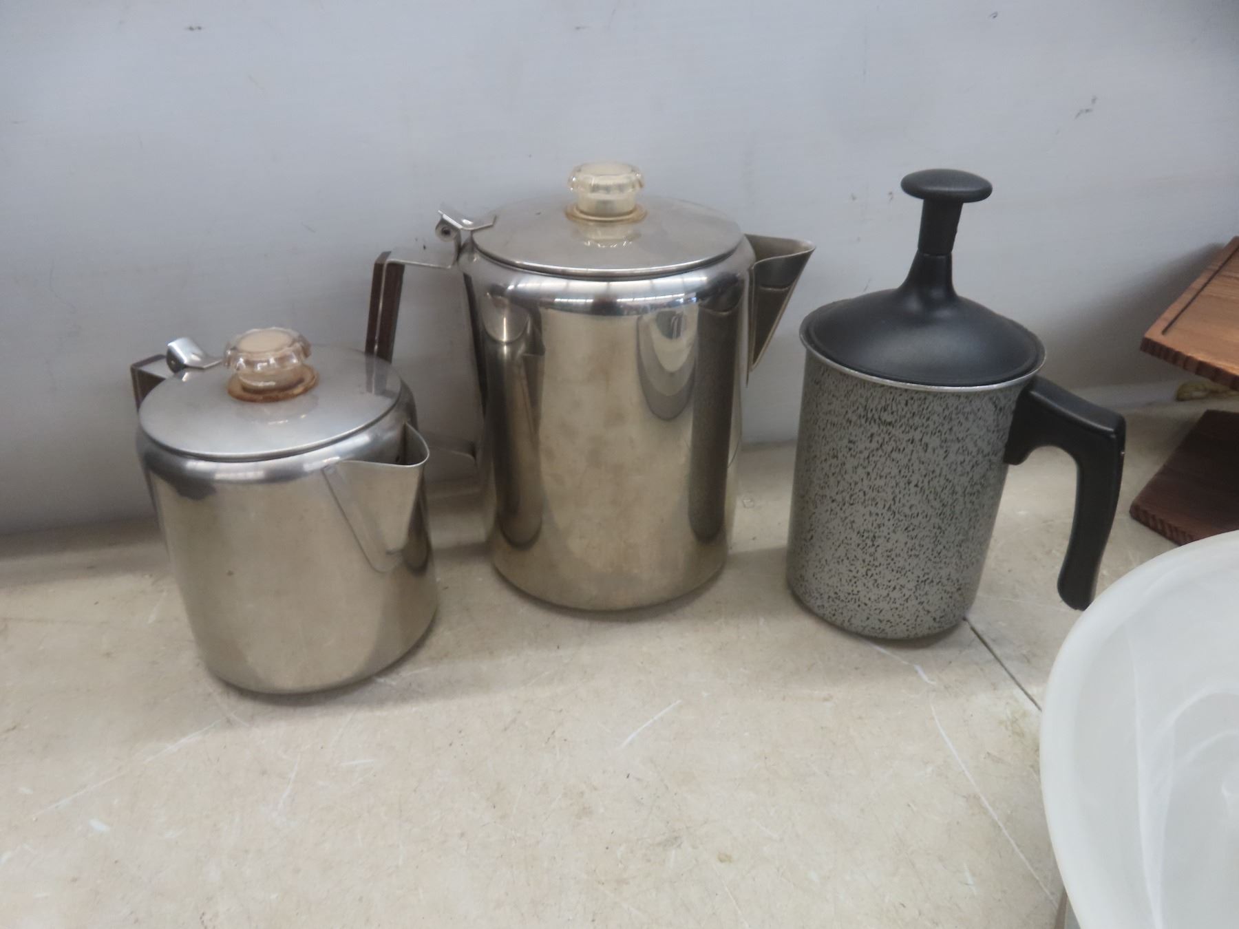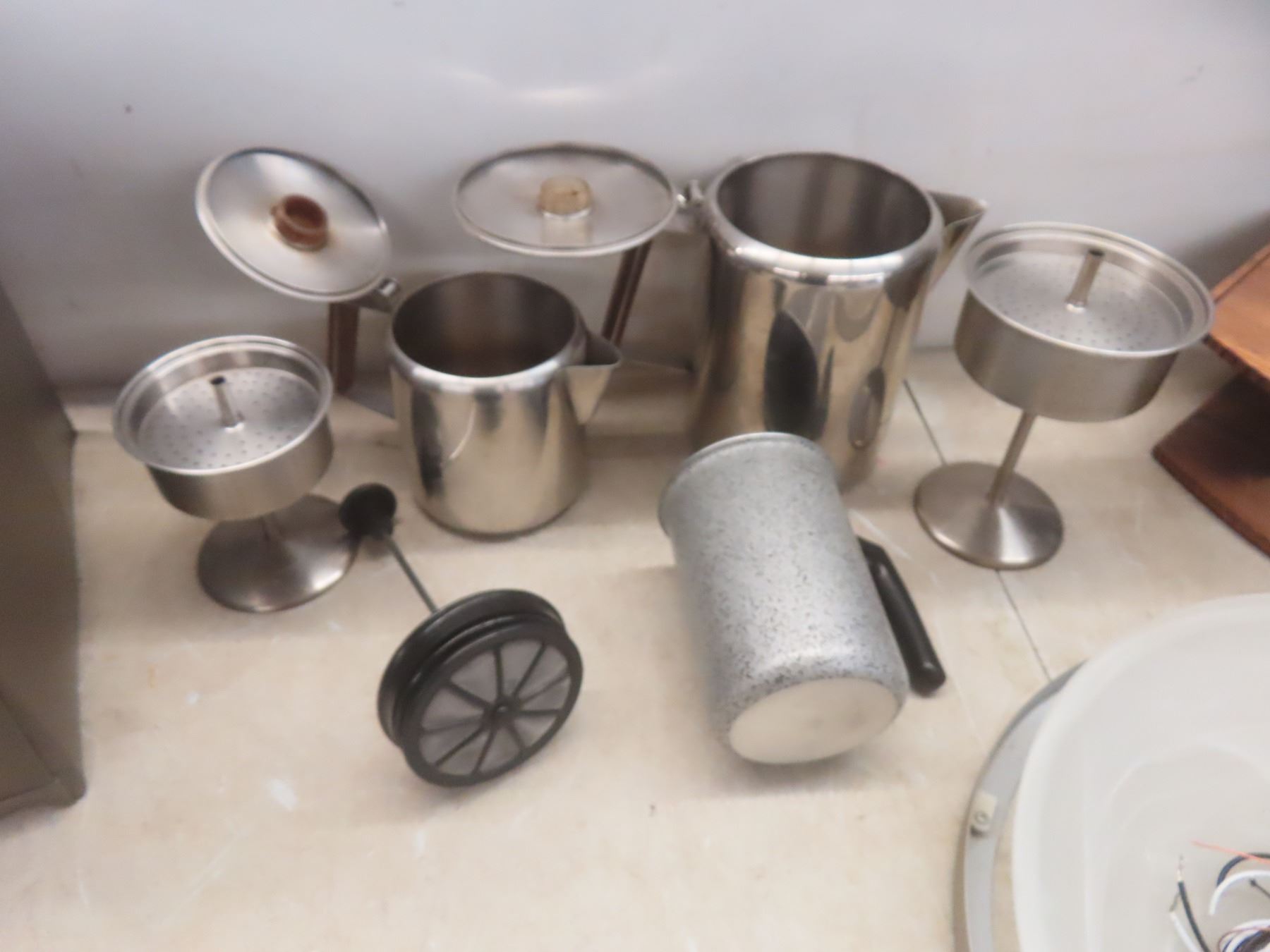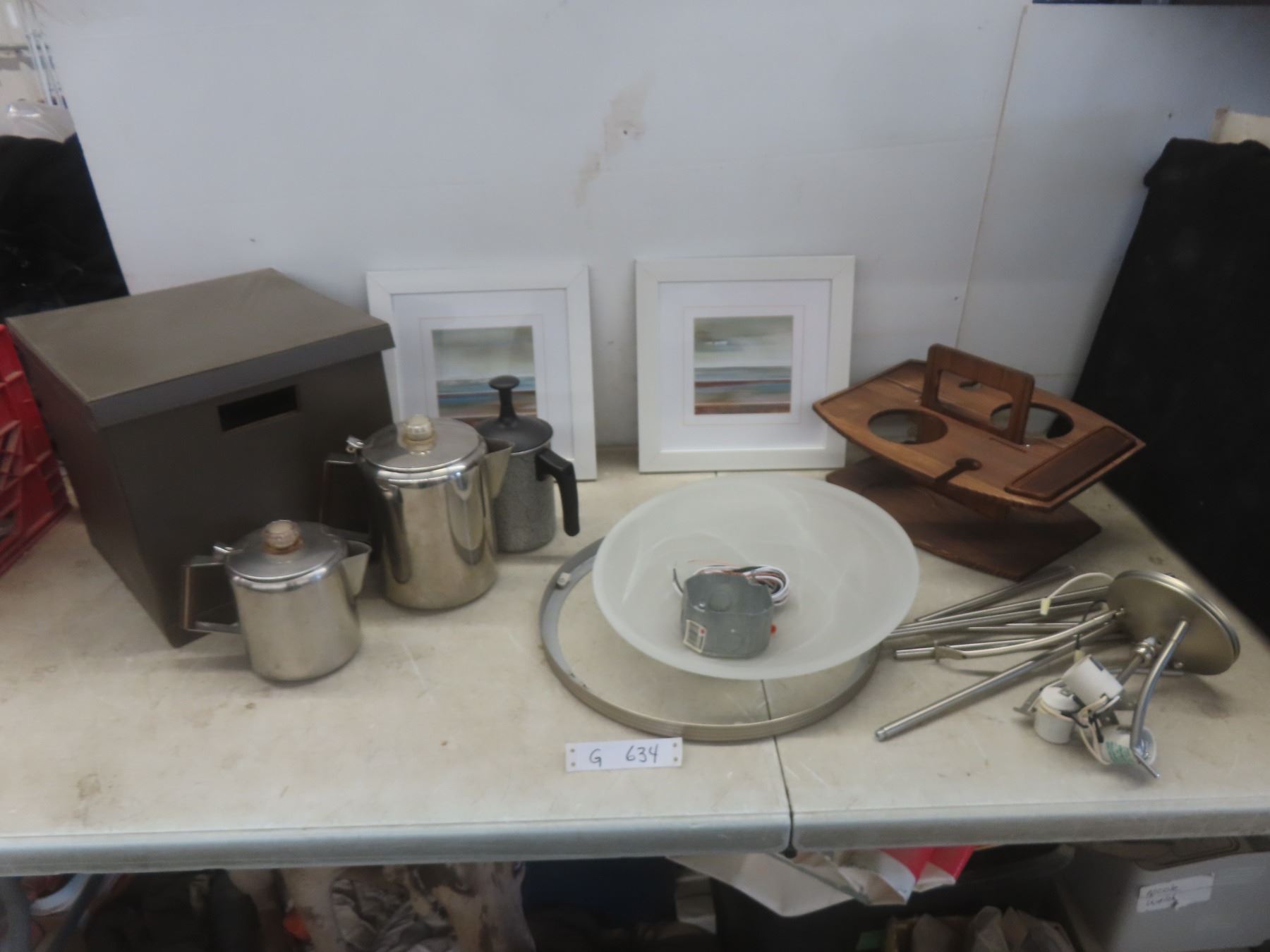 2 Framed Pictures 12x12 Coffee Percolators, Storage Box, Light Fixture