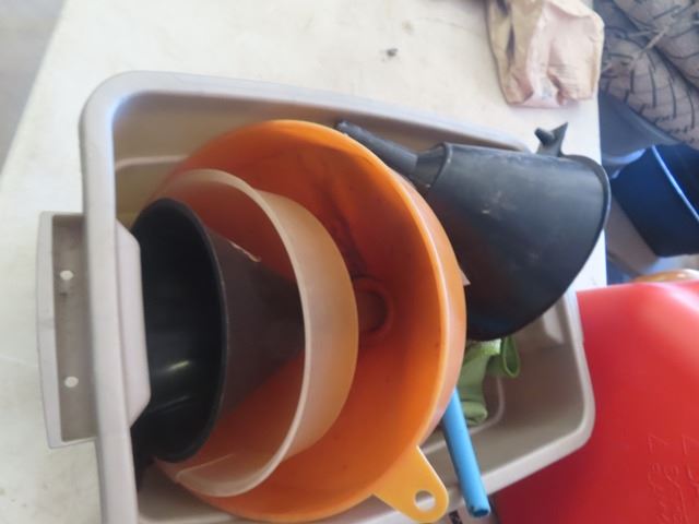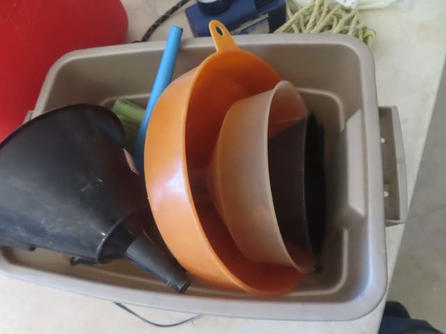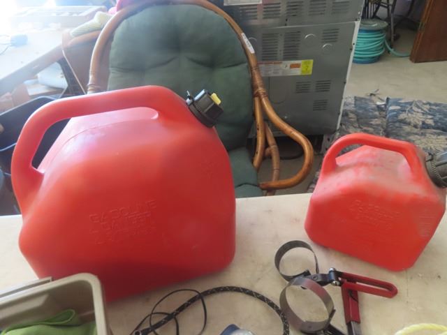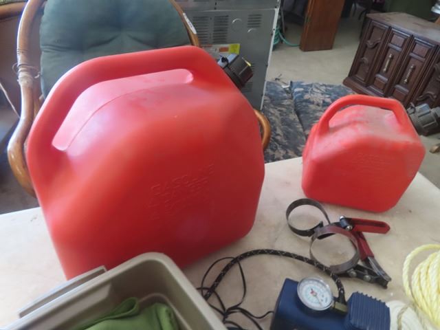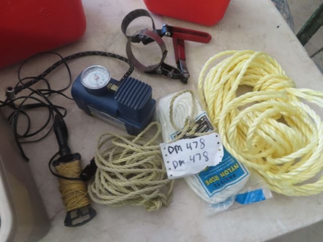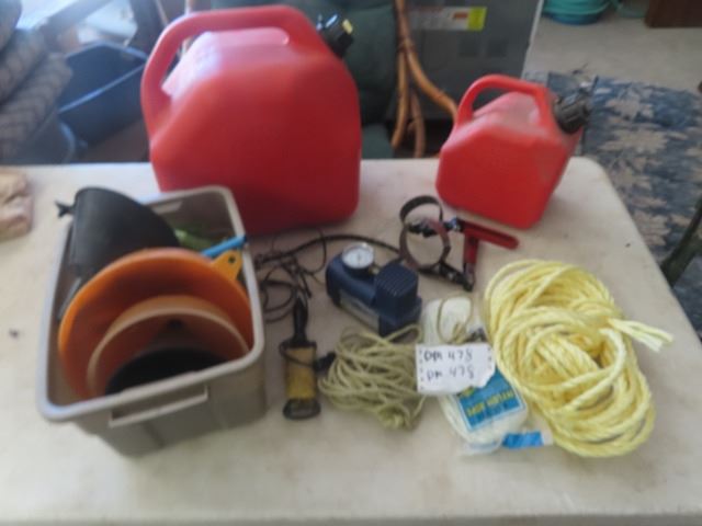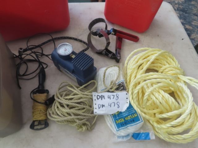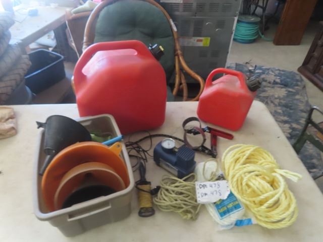 2 Gas Cans, Funnels, Ropes, 12V Air Compressor, Filter Wrench