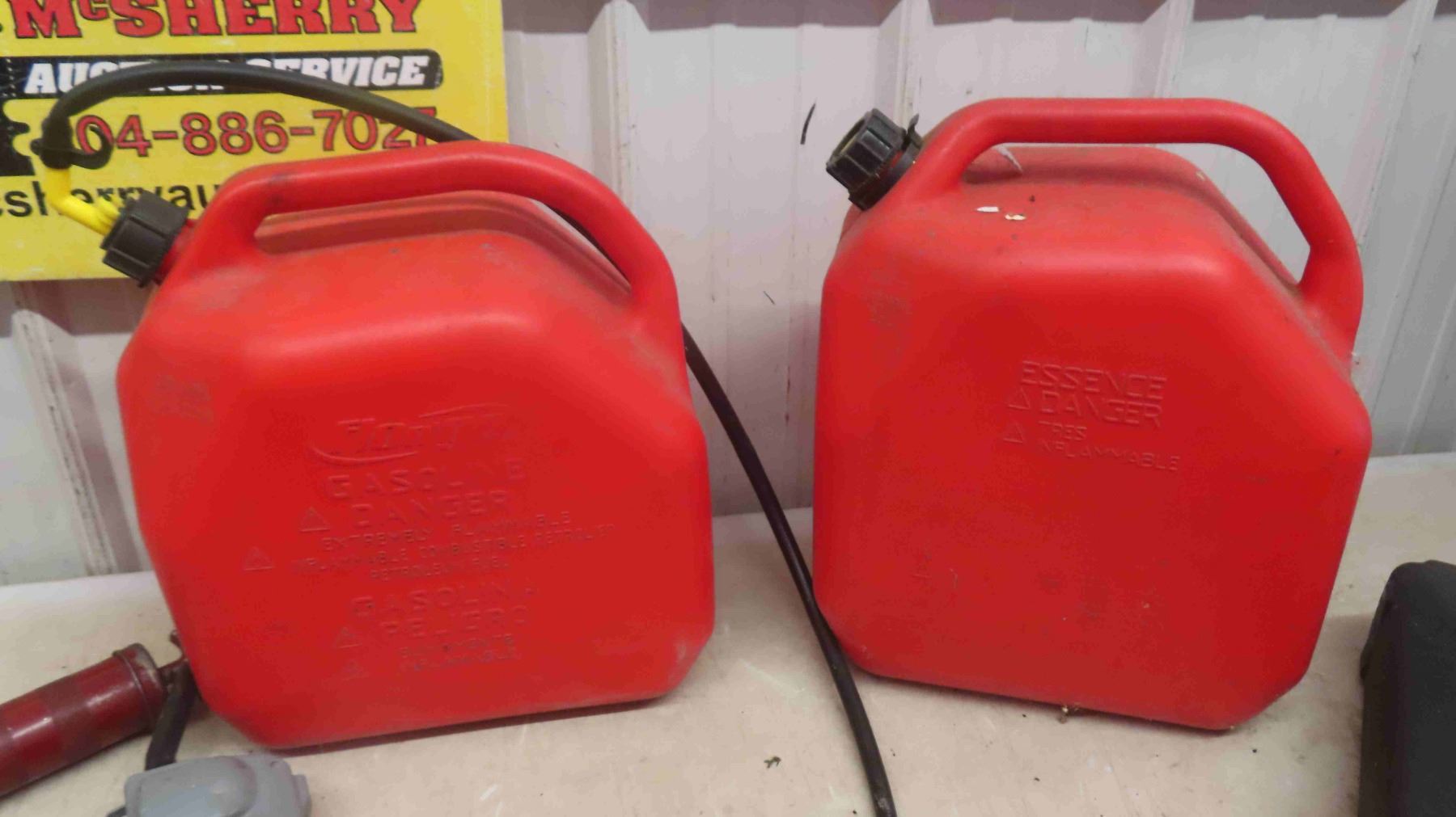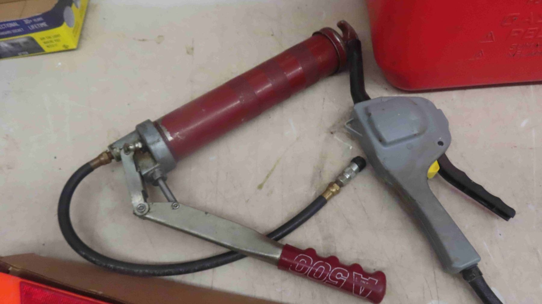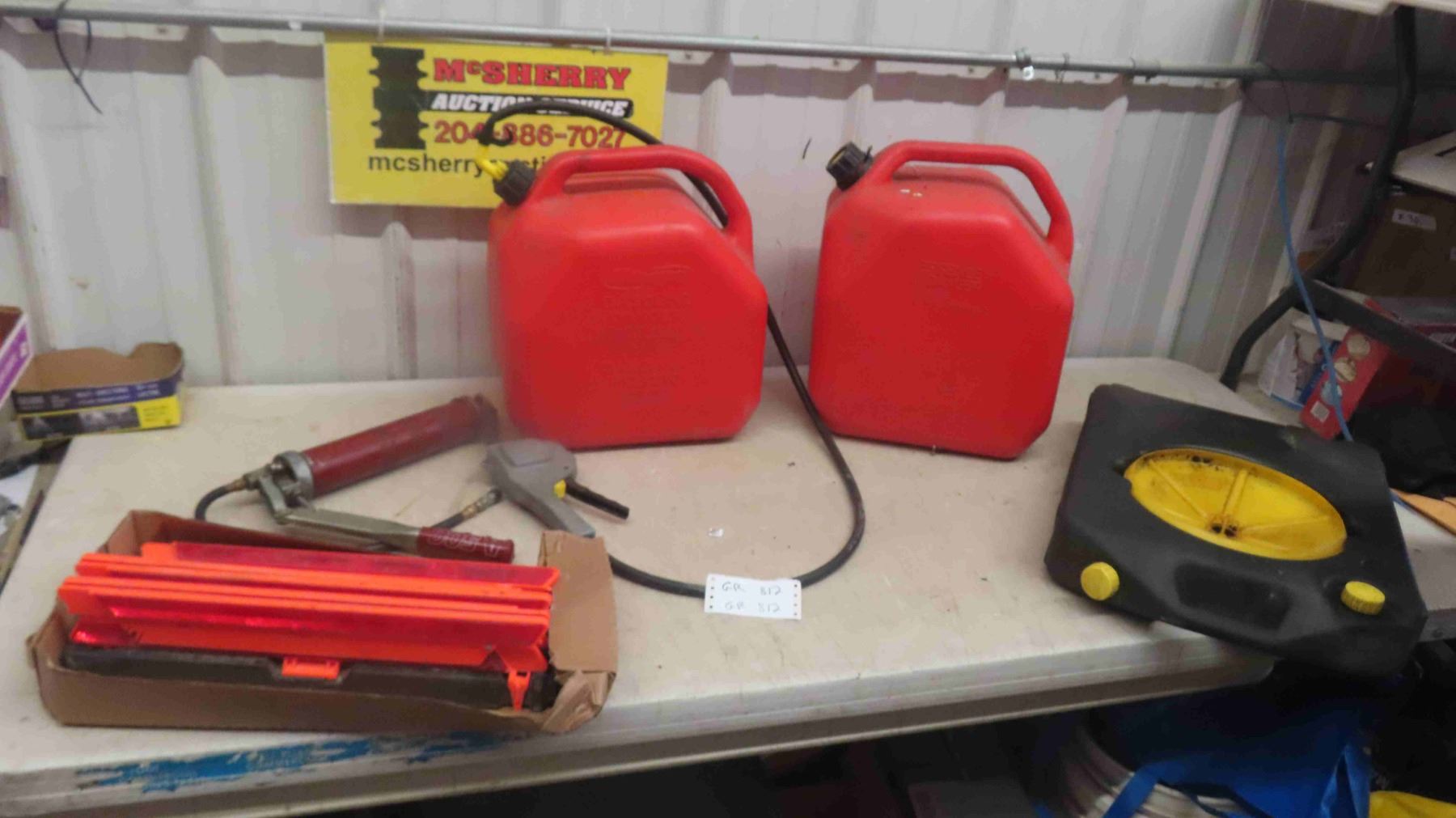2 Gas Cans , Oil Catcher, Grease Gun , Magnetic Road Flares