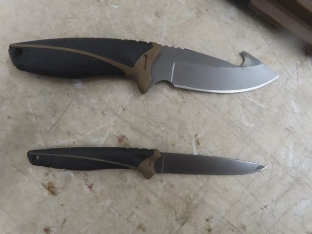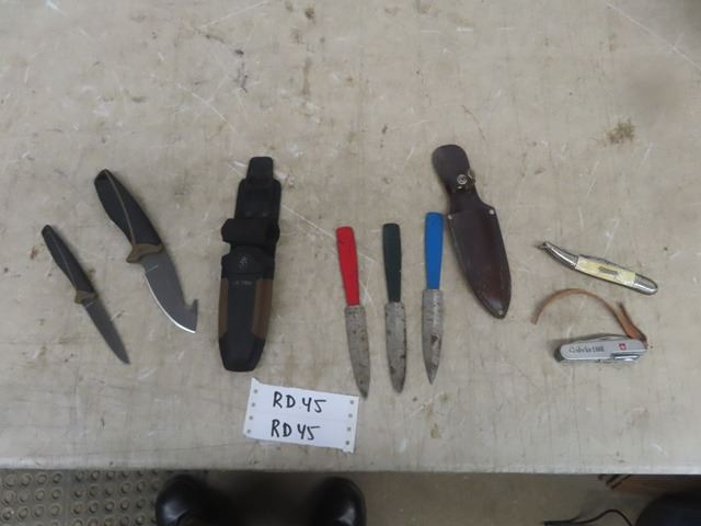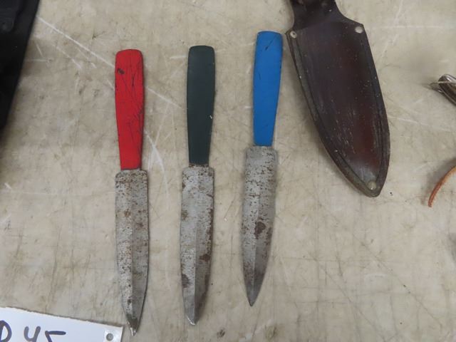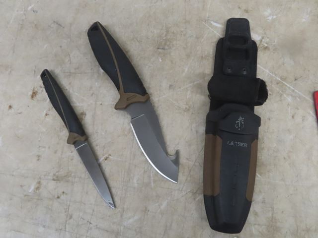 2 Gerber Knives + Holder, 3 Throwing Knives, 2 Pocket Knives