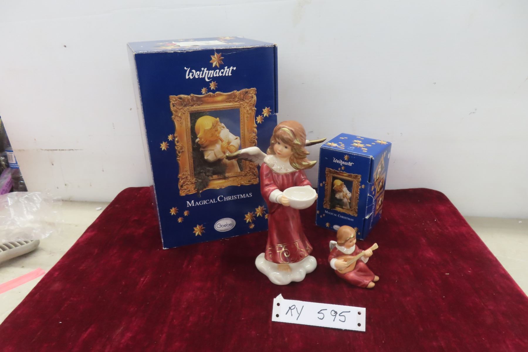 2 Goebel Hummel Red Christmas Angels Holding Bowl for a Candle 8 3/4" Tall + Holding Mandolin 3 1/4" Tall