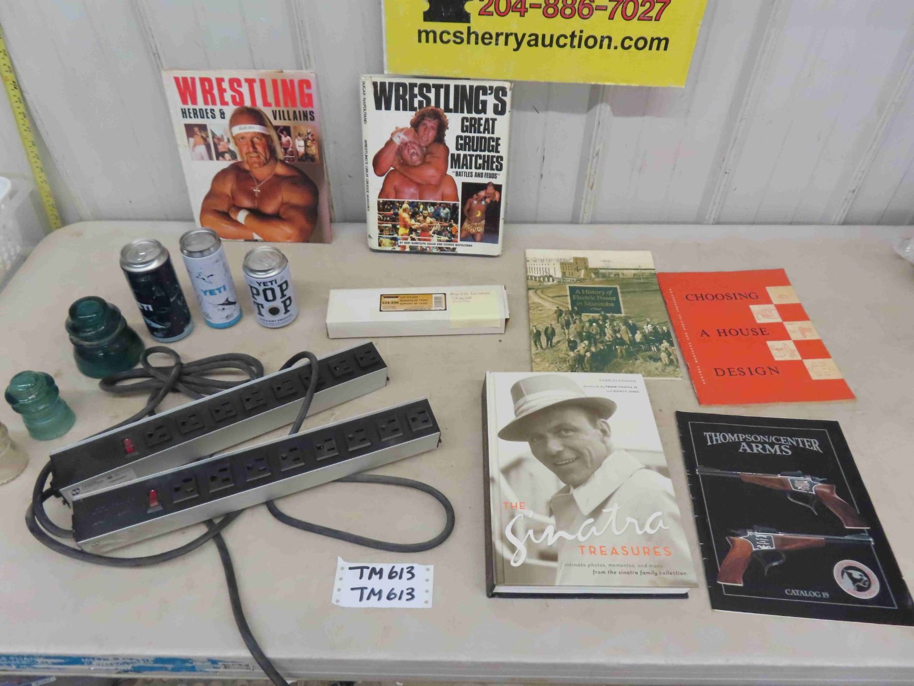 2 Heavy Duty Power Bars, 2 Wrestling Books, Frank Sinatra Book, Insulators, Other