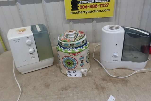 2 Humidifiers; Honeywell + Holmes & Beverage Decanter with Chip on Lid