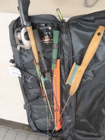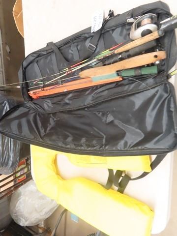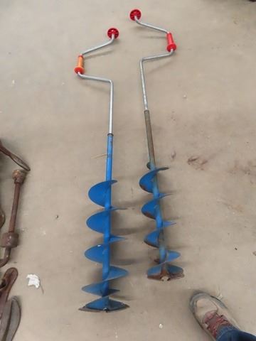 2 Ice Fishing Augers, Ice Fishing Rods, & Life Jackets