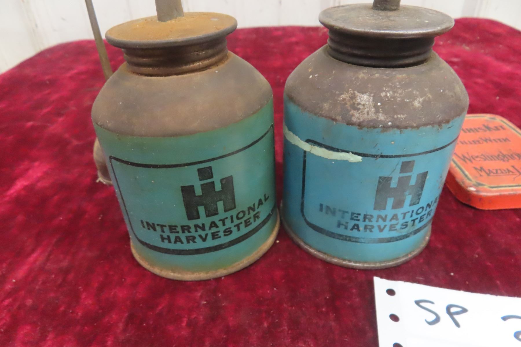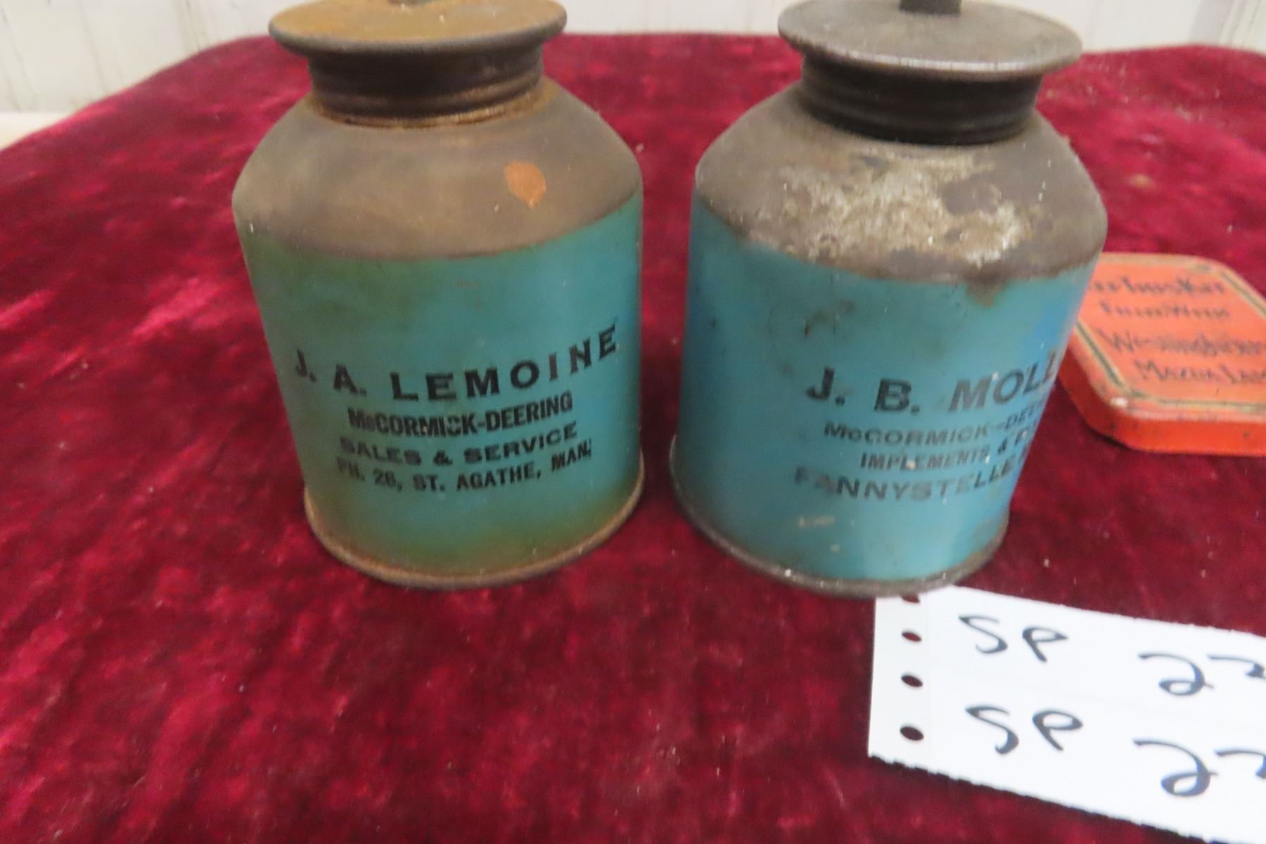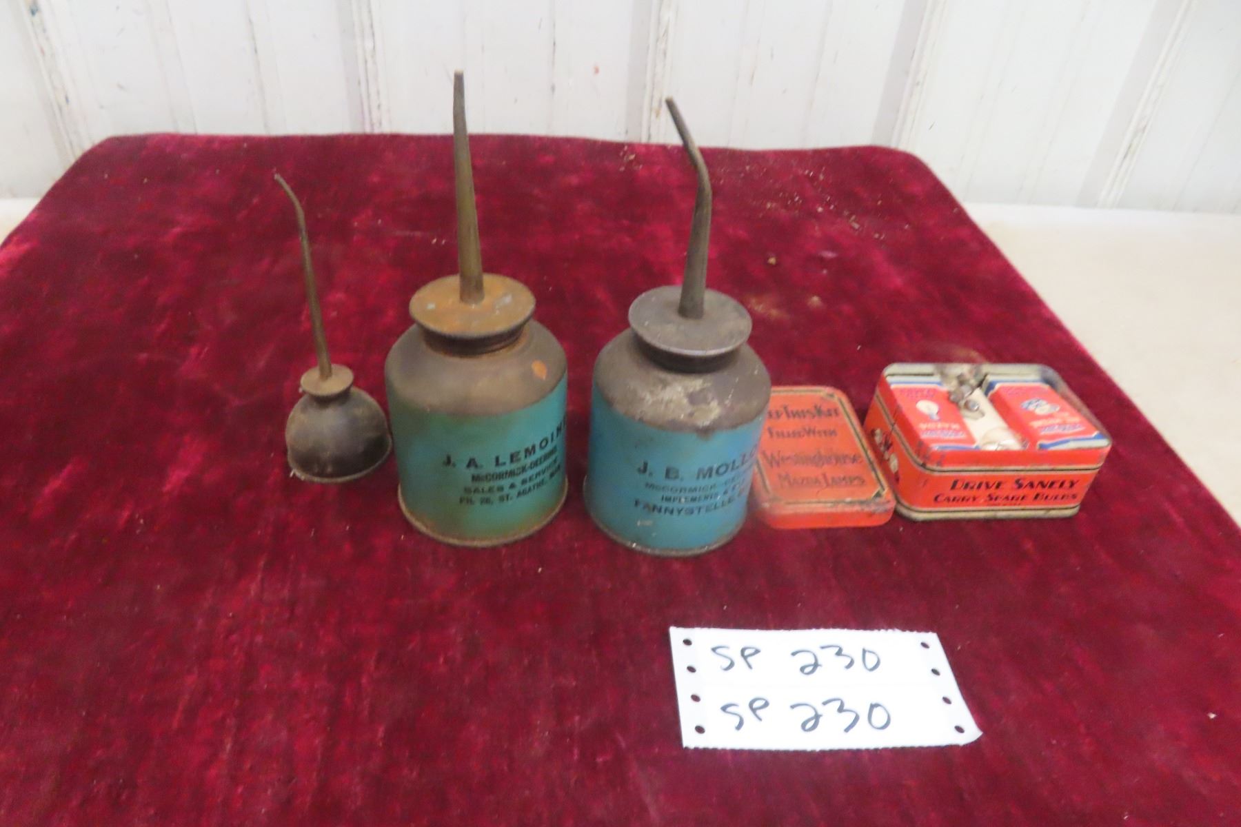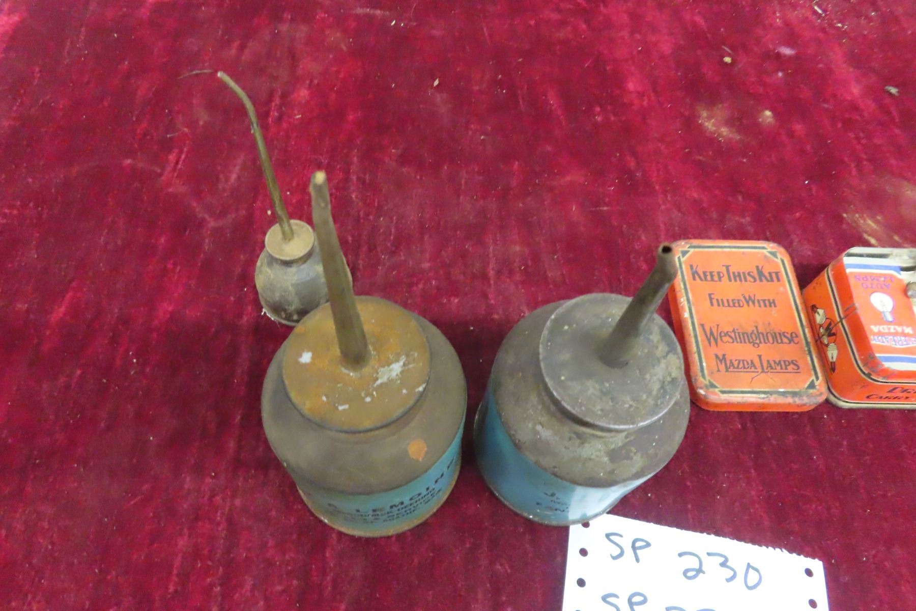 (2) International Oil Squirt Cans, J.A. Lemoine St. Agathe & J.B. Mollot Fannystelle & Westinghouse Carry Spare Bulbs in Case with Co-op Case Winnipeg