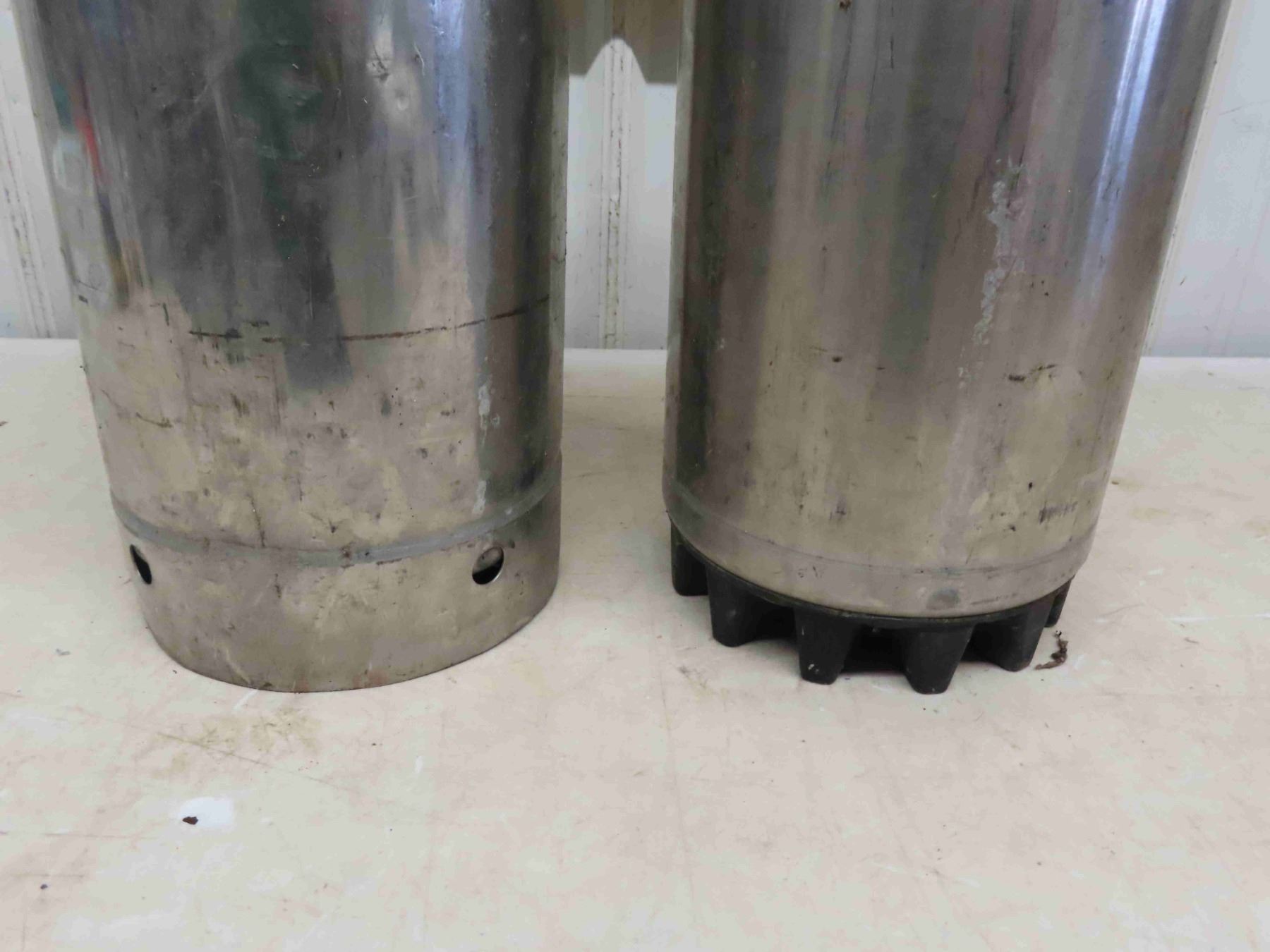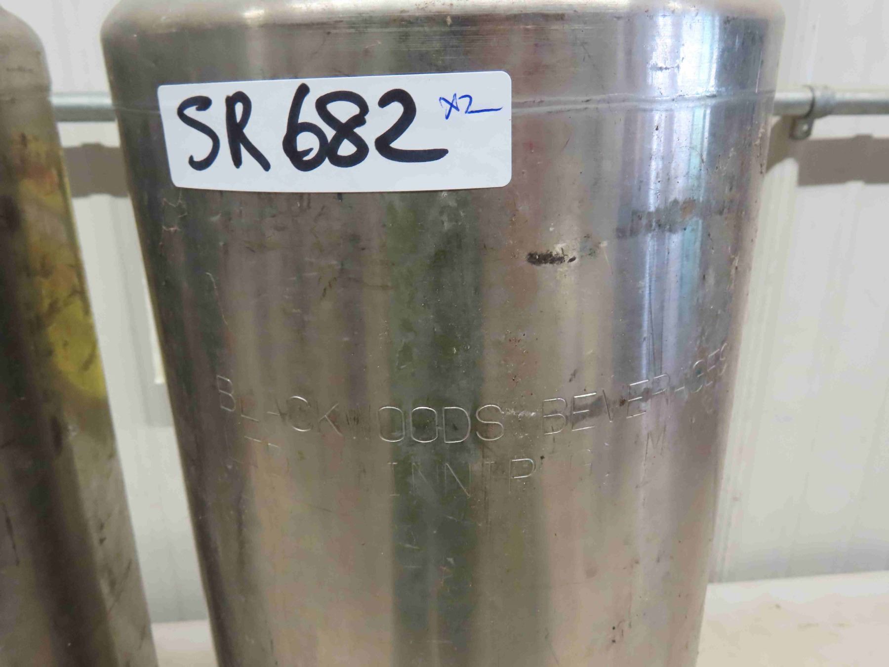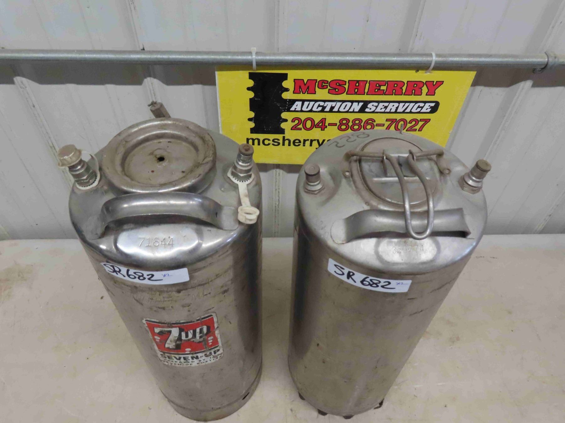 2 Large Chrome Syrup Premix Canisters - 1 Has 7Up Logo, 24.5" Tall